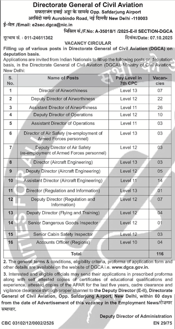 The Directorate General of Civil Aviation (DGCA), under the Ministry of Civil Aviation, has invited applications from eligible Indian officers for 116 vacancies across multiple technical and administrative posts on a deputation basis.