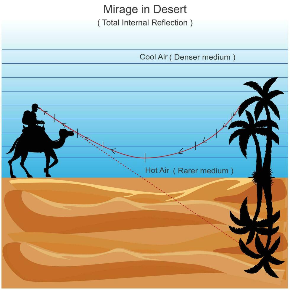 Solution:The mirage is caused by the refraction and total internal reflection of light at layers of air of different densities. In Desert areas, the successive upper layer is denser than those below there due to terrestrial heating.A ray of light coming from a distant object, like the top of a tree gets refracted from a denser to a rarer medium. Consequently, the refracted ray bends away from the normal until at a particular layer, the light is incident at an angle greater than the critical angle.