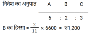 50. A, B और C ने साझेदारी की। A ने B से 3 गुना अधिक निवेश किया और B ने C द्वारा निवेश किए गए निवेश का 2/3 गुना निवेश किया। वर्ष के अंत में, कुल लाभ 6600 रुपये था। B का लाभ कितना है? [RRB NTPC 10/01/2021 (Evening)]