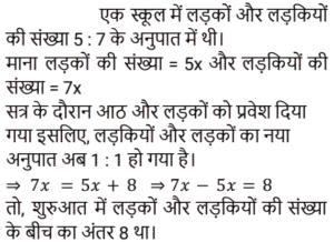 44. एक स्कूल में लड़कों और लड़कियों की संख्या 5 : 7 के अनुपात में थी। सत्र के दौरान आठ और लड़कों को प्रवेश दिया गया। लड़कियों और लड़कों का नया अनुपात 1 : 1 है। शुरुआत में लड़कों और लड़कियों की संख्या के बीच का अंतर कितना था? [RRB NTPC 07/01/2021 (Morning)]