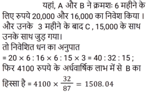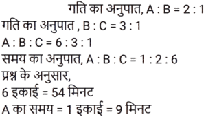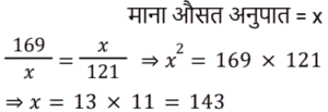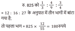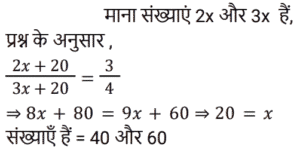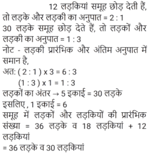 अनुपात-समानुपात Part-5Total Questions: 5041. A, B से दोगुना तेज है और B, C से तीन गुना तेज है। C द्वारा 54 मिनट में तय की गई यात्रा A द्वारा कितने मिनट में तय की जाएगी? [RRB NTPC 07/03/2021 (Morning)](a) 30 min (b) 27 min (c) 18 min (d) 9 minCorrect Answer: (d) 9 minSolution:42. यदि 825 रुपये को 1/3 : 4/9 : 3/4 के अनुपात में तीन भागों में विभाजित किया जाता है, तो पहला भाग होगा : [RRB NTPC 08/03/2021 (Morning)](a) Rs. 190 (b) Rs. 204 (c) Rs. 180(d) Rs. 210Correct Answer: (c) Rs. 180Solution:43. A और B ने क्रमशः 20,000 और 16,000 रुपये का निवेश करके एक साझेदारी में प्रवेश किया। 3 महीने के बाद, C 15,000 रुपये के निवेश के साथ उनके साथ जुड़ गया। 4100 रुपये के अर्धवार्षिक लाभ में B का हिस्सा क्या होगा? [RRB NTPC 08/03/2021 (Morning)](a) Rs. 1681.56 (b) Rs. 1508.04(c) Rs. 1200.68 (d) Rs. 1428.56Correct Answer: (b) Rs. 1508.04Solution:44. जब एक बार ग्राफ को 1 cm = 20 इकाई के पैमाने पर खींचा जाता है, तो 4.7 cm ऊँचाई वाले आयत द्वारा निरूपित मान कितना होगा? [RRB NTPC 09/03/2021 (Morning)](a) 96 इकाई (b) 95 इकाई (c) 94 इकाई(d) 98 इकाईCorrect Answer: (c) 94 इकाईSolution:45. यदि a/b = 4/3 है, तो (6a + 2b) / (4a − 2b) का मान क्या होगा? [RRB NTPC 09/03/2021 (Morning)](a) 5 (b) 4 (c) 6 (d) 3Correct Answer: (d) 3Solution:46. 169 और 121 के बीच अनुपातिक माध्य ज्ञात कीजिए। [RRB NTPC 09/03/2021 (Morning)](a) 179 (b) 143(c) 147 (d) 165Correct Answer: (b) 143Solution:47. यदि x का 50%, y के 25% के समान है, तो x : y किसके बराबर है : [RRB NTPC 09/03/2021 (Morning)](a) 3 : 2 (b) 2 : 1 (c) 2 : 3 (d) 1 : 2Correct Answer: (d) 1 : 2Solution:x का 50% = y का 25% 48. दो संख्याएँ 2 : 3 के अनुपात में हैं। यदि प्रत्येक संख्या में 20 की वृद्धि की जाती है, तो अनुपात 3 : 4 हो जाता है। संख्याएँ हैं : [RRB NTPC 09/03/2021 (Morning)](a) 40, 60 (b) 20, 25(c) 30, 40 (d) 20, 30Correct Answer: (a) 40, 60 Solution:49. राकेश के पास सिर्फ 2 रुपये और 5 रुपये के सिक्के हैं। यदि उसके पास कुल सिक्कों की संख्या 60 है और उसके पास 240 रुपये हैं, तो क्रमशः 2 रुपये और 5 रुपये के सिक्कों की संख्या ज्ञात कीजिए। [RRB NTPC 11/03/2021 (Morning)](a) 10 और 50 (b) 20 और 40(c) 15 और 45 (d) 25 और 35Correct Answer: (b) 20 और 40Solution:50. लड़कों और लड़कियों के एक समूह से, यदि 12 लड़कियाँ समूह छोड़ती हैं, तो लड़कों का लड़कियों से अनुपात 2 : 1 है। इसके बाद, यदि 30 लड़के समूह छोड़ देते हैं, तो लड़कियों का लड़कों से अनुपात 3 : 1 हो जाता है। समूह में लड़कों और लड़कियों की प्रारंभिक संख्या ज्ञात करें। [RRB NTPC 11/03/2021 (Evening)](a) 34 लड़के और 35 लड़कियाँ(b) 38 लड़के और 25 लड़कियाँ(c) 40 लड़के और 20 लड़कियाँ(d) 36 लड़के और 30 लड़कियाँCorrect Answer: (d) 36 लड़के और 30 लड़कियाँSolution:Submit Quiz« Previous12345