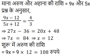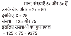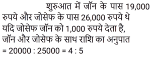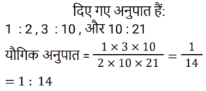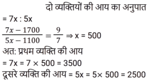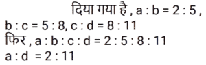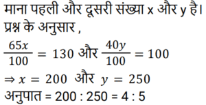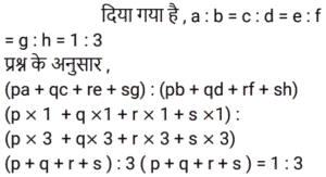 अनुपात-समानुपात Part-6Total Questions: 5031. 1 : 2, 3 : 10 और 10 : 21 का यौगिक अनुपात है: [RRB NTPC 05/04/2021 (Morning)](a) 1 : 7 (b) 7 : 1 (c) 14 : 1 (d) 1 : 14Correct Answer: (d) 1 : 14Solution:32. दो व्यक्तियों की आय का अनुपात 7 : 5 है और उनके संबंधित व्यय का अनुपात 9 : 7 है। प्रत्येक व्यक्ति की संबंधित आय ज्ञात कीजिए यदि वे क्रमशः 1,700 रुपये और 1,100 रुपये बचाते हैं। [RRB NTPC 05/04/2021 (Evening)](a) Rs. 5,000, Rs. 2,000(b) Rs. 5,500, Rs. 4,500(c) Rs. 4,500, Rs. 3,500(d) Rs. 3,500, Rs. 2Correct Answer: (d) Rs. 3,500, Rs. 2Solution:33. यदि a : b = c : d = e : f = g : h = 1 : 3, तो निम्नलिखित का मान क्या होगा: [RRB NTPC 05/04/2021 (Evening)](pa + qc + re + sg) : (pb + qd + rf + sh)(a) 1 : 5 (b) 1 : 2 (c) 1 : 3(d) 1 : 4Correct Answer: (c) 1 : 3Solution:34. यदि a : b = 2 : 5, b : c = 5 : 8, c : d = 8 : 11, तो a : d है: [RRB NTPC 06/04/2021 (Morning)](a) 3 : 5 (b) 5 : 8 (c) 2 : 11(d) 2 : 7Correct Answer: (c) 2 : 11Solution:35. यदि चार संख्याओं में से दूसरी पहली की तीन गुनी है, तीसरी दूसरी से चार गुनी है, चौथी तीसरी से पांच गुनी है और चार संख्याओं का माध्य 1900 है, तो सबसे छोटी संख्या है: [RRB NTPC 06/04/2021 (Morning)](a) 6000 (b) 1200 (c) 50 (d) 100Correct Answer: (d) 100Solution:माना चार संख्याए a , b , c , d है ; 36. जॉन और जोसेफ के पास क्रमशः 19,000 रुपये और 26,000 रुपये हैं। यदि जोसेफ जॉन को 1,000 रुपये देता है, तो जॉन और जोसेफ के पास राशि का अनुपात है : [RRB NTPC 06/04/2021 (Evening)](a) 19 : 26 (b) 2 : 3 (c) 20 : 27 (d) 4 : 5Correct Answer: (d) 4 : 5Solution:37. पहली संख्या का 65% 130 है और दूसरी संख्या का 40% 100 है। पहली संख्या का दूसरी संख्या से अनुपात है : [RRB NTPC 06/04/2021 (Evening)](a) 5 : 8 (b) 1 : 2 (c) 4 : 5(d) 8 : 5Correct Answer: (c) 4 : 5Solution:38. अरुण और अहान के पास धन की राशि का अनुपात 9 : 5 है। यदि अरुण अपने हिस्से में से अहान को 12 रुपये देता है, तो अनुपात बदल कर 4 : 3 हो जाएगा। अरुण के पास शुरू में कितने पैसे थे? [RRB NTPC 07/04/2021 (Evening)](a) Rs. 90 (b) Rs. 144 (c) Rs. 108(d) Rs. 126Correct Answer: (c) Rs. 108Solution:39. एक संख्या का 3/5 , दूसरी संख्या के 1/2 से 10 अधिक है। यदि पहली संख्या के 3/7 में से 8 घटा दिया जाए, तो वह दूसरी संख्या के 1/2 से 4 कम हो जाती है। दो संख्याओं का योग क्या है? [RRB NTPC 08/04/2021 (Evening)](a) 56 (b) 55 (c) 54 (d) 57Correct Answer: (d) 57Solution:40. 5 : 3 के अनुपात में दो संख्याओं के बीच का अंतर 50 है। संख्याओं का गुणनफल क्या है? [RRB NTPC 08/04/2021 (Evening)](a) 9375 (b) 1035 (c) 9975 (d) 8575Correct Answer: (a) 9375 Solution:Submit Quiz« Previous12345Next »