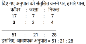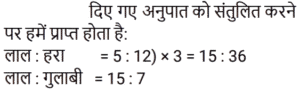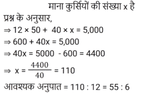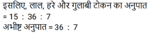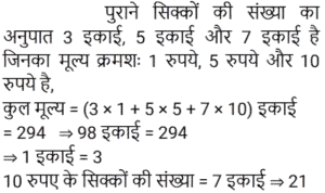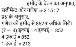 अनुपात-समानुपात Part-7Total Questions: 5031. हमीद, सलमान और गणेश के वेतन का अनुपात 3 : 5 : 7 है। यदि गणेश को हमीद से 852 रुपये अधिक मिलते हैं, तो सलमान का वेतन (रुपये में) कितना है? [RPF S.I. 06/01/2019 (Afternoon)](a) 1,065 (b) 1,035 (c) 1,055 (d) 1,045Correct Answer: (a) 1,065 Solution:तब, 5 इकाई = 1065 रुपये32. आमिर ने 4 बच्चों के बीच 775 उपहार बांटे। पहले बच्चे का हिस्सा, दूसरे बच्चे के हिस्से का दोगुना, तीसरे बच्चे के हिस्से का तिगुना और चौथे बच्चे के हिस्से का चार गुना है। पहले और दूसरे बच्चे द्वारा प्राप्त कुल उपहारों की संख्या बताइए। [RPF S.I. 10/01/2019 (Morning)](a) 558 (b) 554 (c) 556 (d) 552Correct Answer: (a) 558 Solution:33. एक बॉक्स में तीन अलग-अलग प्रकार के पुराने सिक्के 3 : 5 : 7 के अनुपात में हैं। पुराने सिक्कों के मूल्य क्रमशः 1 रुपये, 5 रुपये और 10 रुपये हैं। यदि बॉक्स में रखे सिक्कों की कुल कीमत 294 रु. है, तो 10 रुपये के पुराने सिक्कों की संख्या बताइए। [RPF S.I. 10/01/2019 (Morning)](a) 22 (b) 24 (c) 21(d) 23Correct Answer: (c) 21Solution:34. एक बगीचे में आम और नीम के 361 पौधे लगाये जाते हैं। यदि आम और नीम के पौधों का अनुपात 8 : 11 है, तो बगीचे में नीम के कितने पौधे लगाये गये हैं? [RRB ALP 09/08/2018 (Afternoon)](a) 57 (b) 209(c) 152 (d) 171Correct Answer: (b) 209Solution:35. मिश्रण में रेत के साथ बजरी का अनुपात 17 : 8 है जबकि बजरी और सीमेंट का अनुपात 6 : 17 है। मिश्रण में रेत के साथ सीमेंट का क्या अनुपात है? [RRB ALP 09/08/2018 (Evening)](a) 3 : 4 (b) 17 : 17 (c) 289 : 48 (d) 8 : 6Correct Answer: (a) 3 : 4 Solution:36. जर्मन सिल्वर की किसी मिश्रित धातु में तांबे से जस्ते का अनुपात 17 : 7 था जबकि निकल से जस्ते का अनुपात 4 : 3 था। मिश्रित धातु में तांबे से जस्ते से निकल का क्रमशः अनुपात कितना था? [RRB ALP 10/08/2018 (Afternoon)](a) 51 : 21 : 28 (b) 17 : 21 : 4(c) 68 : 28 : 21 (d) 17 : 28 : 3Correct Answer: (a) 51 : 21 : 28 Solution:37. नानी और लीला की लंबाई का अनुपात 4 : 3 है। यदि लीला की लंबाई 1.2 मीटर है, तो नानी की लंबाई कितनी है? [RRB ALP 10/08/2018 (Evening)](a) 0.9 मीटर (b) 2 मीटर(c) 1.6 मीटर (d) 1.8 मीटरCorrect Answer: (c) 1.6 मीटर Solution:38. विष्णु 12 मेज और कुछ कुर्सियाँ खरीदने के लिए ₹5000 खर्च करता है। एक मेज का मूल्य ₹50 और एक कुर्सी का मूल्य ₹40 है। खरीदी गयी कुर्सियों की संख्या का मेज की संख्या से अनुपात ज्ञात कीजिए। [RRB ALP 13/08/2018 (Morning)](a) 55 : 4 (b) 5 : 1 (c) 5 : 2 (d) 55 : 6Correct Answer: (d) 55 : 6Solution:39. लाल, हरे और गुलाबी टोकन वाले बैग में, लाल रंग के टोकनों का हरे टोकनों के साथ अनुपात 5 : 12 है जबकि गुलाबी टोकनों का लाल टोकनों के साथ 7 : 15 का अनुपात था। हरे टोकनों का गुलाबी टोकनों के साथ क्या अनुपात था? [RRB ALP 13/08/2018 (Morning)](a) 36 : 7 (b) 25 : 28 (c) 12 : 7 (d) 28 : 25Correct Answer: (a) 36 : 7 Solution:40. गूंथे हुए आटे में चीनी और आटे का अनुपात 2 : 7 है। इस गूंथे हुए आटे के 9 किलोग्राम में जॉन ने कुछ और चीनी मिलाकर अनुपात को 2 : 5 बना दिया। जॉन ने बाद में कितनी चीनी मिलाई? [RRB ALP 13/08/2018 (Afternoon)](a) 1.2 किलोग्राम (b) 750 ग्राम (c) 800 ग्राम(d) 1 किलोग्रामCorrect Answer: (c) 800 ग्रामSolution:Submit Quiz« Previous12345Next »