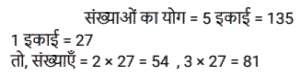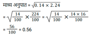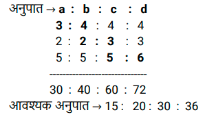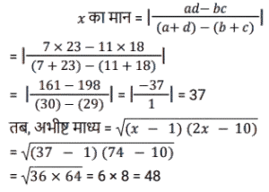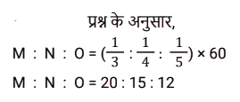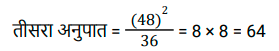 अनुपात – समानुपात (SSC) (Part-II)Total Questions: 5041. जब संख्या 7, 11, 18 और 23 में प्रत्येक में 'X' जोड़ा जाता है, तो इस प्रकार प्राप्त संख्याएं समानुपात में होती है। (x-1) और (2x-10) का माध्यानुपाती क्या है? [SSC CHSL 03/07/2024 (4th Shift)](a) 78(b) 98(c) 48(d) 68Correct Answer: (c) 48Solution:42. 28% को अनुपात के रूप में परिवर्तित कीजिए। [SSC CHSL 04/07/2024 (1st Shift)](a) 25 : 7(b) 7 : 25(c) 7 : 18(d) 18 : 7Correct Answer: (b) 7 : 25Solution:43. उपहार वस्तुओं से भरे एक बॉक्स का वजन 25 kg है। यदि बॉक्स और उपहार वस्तुओं का वजन क्रमशः 1 : 9 के अनुपात में है, तो वस्तुओं का वजन (ग्राम में) क्या है? [SSC CHSL 04/07/2024 (1st Shift)](a) 22500(b) 23500(c) 21500(d) 24500Correct Answer: (a) 22500Solution:44. 36 और 48 का तृतीय समानुपाती ज्ञात कीजिए। [SSC CHSL 04/07/2024 (3rd Shift)](a) 36(b) 54(c) 48(d) 64Correct Answer: (d) 64Solution:45. यदि a : b = 3: 4, b : c = 2 : 3, और c: d = 5 : 6 है, तो a : b : c : d क्या होगा? [SSC CHSL 05/07/2024 (1st Shift)](a) 10 : 20 : 30 : 36(b) 15 : 25 : 30 : 36(c) 15 : 20 : 30 : 36(d) 15 : 20 : 35 : 36Correct Answer: (c) 15 : 20 : 30 : 36Solution:46. यदि = 1/M : 1/N : 1/O = 3 : 4 : 5 है, तो M : N : O का मान क्या होगा? [SSC CHSL 05/07/2024 (2nd Shift)](a) 12 : 15 : 20(b) 20 : 15 : 12(c) 20 : 12 : 15(d) 15 : 20 : 12Correct Answer: (b) 20 : 15 : 12Solution:47. 0.14 और 2.24 का माध्यानुपाती ज्ञात कीजिए। [SSC CHSL 05/07/2024 (3rd Shift)](a) 0.56(b) - 2.39(c) 1.12(d) 1.02Correct Answer: (a) 0.56Solution:48. 1.25, 5.75 और 3.5 का चतुर्थ समानुपाती ज्ञात कीजिए। [SSC CHSL 05/07/2024 (4th Shift)](a) 4.5(b) 16.1(c) 12.5(d) 6.5Correct Answer: (b) 16.1Solution:49. दो संख्याएँ 2 : 3 के अनुपात में हैं। उनका योग 135 है। संख्याएँ ज्ञात कीजिए। [SSC CHSL 08/07/2024 (2nd Shift)](a) 54, 81(b) 45, 90(c) 50, 85(d) 60, 75Correct Answer: (a) 54, 81Solution:50. 25 और 81 के बीच का माध्यानुपाती ज्ञात कीजिए। [SSC CHSL 08/07/2024 (3rd Shift)](a) 12(b) 36(c) 81(d) 45Correct Answer: (d) 45Solution:Submit Quiz« Previous12345