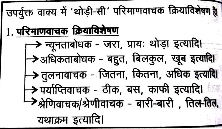 Solution:वह बिल्कुल थक गया है। इस वाक्य में परिमाणवाचक क्रियाविशेषण है। बहुत, अति, बड़ा, बिलकुल, अतिशय, अत्यन्त, निपट, सर्वथा, खूब इत्यादि परिमाणवाचक क्रियाविशेषण के अन्तर्गत आने वाले अधिकताबोधक क्रियाविशेषण के उदाहरण हैं।अन्य महत्त्वपूर्ण तथ्य-