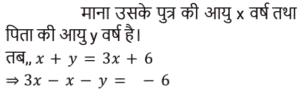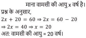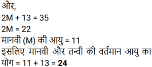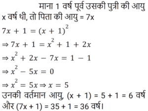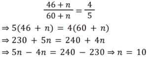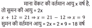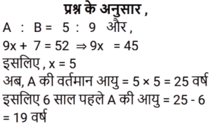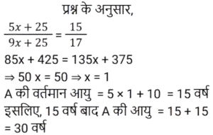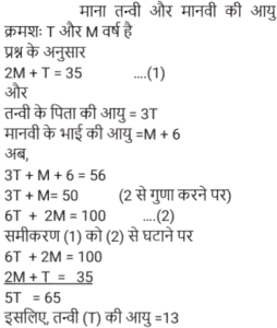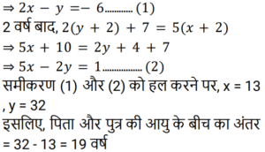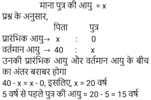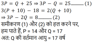 आयु Part-2Total Questions: 501. एक पिता और उसके पुत्र की वर्तमान आयु का योग, पुत्र की वर्तमान आयु के 3 गुने से 6 वर्ष अधिक है। 2 वर्ष बाद, पिता की आयु का 2 गुना, पुत्र की आयु के 5 गुने से 7 वर्ष कम होगा। पिता और पुत्र की आयु का अंतर (वर्ष में) ज्ञात कीजिए। [Group D 02/09/2022 (Evening)](a) 17 (b) 20 (c) 19(d) 23Correct Answer: (c) 19Solution:2. सुमन की वर्तमान आयु वेंकट की वर्तमान आयु की दोगुनी है। 12 वर्ष के बाद वेंकट की आयु 21 वर्ष होगी। सुमन की वर्तमान आयु ज्ञात कीजिए। [Group D 02/09/2022 (Evening)](a) 18 वर्ष (b) 20 वर्ष (c) 16 वर्ष (d) 22 वर्षCorrect Answer: (a) 18 वर्ष Solution:3. वामसी के पिता की आयु 60 वर्ष है। उनकी आयु वामसी की आयु के दोगुने से 20 वर्ष अधिक है। वामसी की आयु ज्ञात कीजिए। [Group D 05/09/2022 (Morning)](a) 20 वर्ष (b) 30 वर्ष (c) 25 वर्ष (d) 15 वर्षCorrect Answer: (a) 20 वर्ष Solution:4. एक पिता ने अपने बेटे से कहा, “मैं तुम्हारे जन्म के समय तुम्हारी उम्र के बराबर था।” यदि पिता की वर्तमान आयु 40 वर्ष है, तो 5 वर्ष पहले पुत्र की आयु क्या थी? [Group D 06/09/2022 (Afternoon)](a) 14 वर्ष (b) 16 वर्ष (c) 18 वर्ष (d) 15 वर्षCorrect Answer: (d) 15 वर्षSolution:5. P की वर्तमान आयु का तीन गुना, Q की वर्तमान आयु से 25 वर्ष अधिक है। 10 वर्ष बाद, Q की आयु का दोगुना, P की आयु के तीन गुने से 18 वर्ष कम होगा। Q की वर्तमान आयु (वर्ष में) ज्ञात कीजिए। [Group D 08/09/2022 (Afternoon)](a) 19 (b) 21 (c) 17(d) 16Correct Answer: (c) 17Solution:6. एक वर्ष पहले, एक आदमी की आयु उसकी पत्नी की आयु की 7 गुनी थी। अब उसकी आयु उसकी पत्नी की आयु के वर्ग के बराबर है। यदि पत्नी की आयु एक वर्ष से अधिक हो चुकी है, तो उनकी वर्तमान आयु ज्ञात कीजिए। [Group D 08/09/2022 (Evening)](a) 7 और 49 (b) 4 और 28 (c) 6 और 36(d) 5 और 25Correct Answer: (c) 6 और 36Solution:7. दो व्यक्तियों की वर्तमान आयु क्रमशः 46 वर्ष और 60 वर्ष है। यदि ‘n’ वर्ष बाद, उनकी आयु का अनुपात 4 : 5 है, तो ‘n’ का मान ज्ञात कीजिए। [Group D 09/09/2022 (Morning)](a) 11 (b) 12 (c) 13 (d) 10Correct Answer: (d) 10Solution:8. 10 वर्ष पहले, A और B की आयु का अनुपात 5 : 9 था। अब से 15 वर्ष बाद, उनकी आयु का अनुपात 15 : 17 होगा। अब से 15 वर्ष बाद A की आयु क्या होगी? [Group D 09/09/2022 (Afternoon)](a) 30 वर्ष (b) 38 वर्ष (c) 35 वर्ष (d) 26 वर्षCorrect Answer: (a) 30 वर्ष Solution:9. मानवी की वर्तमान आयु के दो गुने और तन्वी की वर्तमान आयु का योग 35 वर्ष है। तन्वी के पिता की आयु, वर्तमान में तन्वी की आयु की तीन गुनी है। मानवी के भाई की वर्तमान आयु, मानवी की वर्तमान आयु से 6 वर्ष अधिक है। तन्वी के पिता और मानवी के भाई की वर्तमान आयु का योग 56 वर्ष है। मानवी और तन्वी की वर्तमान आयु का योग (वर्ष में) ज्ञात कीजिए। [Group D 09/09/2022 (Evening)](a) 24 (b) 27 (c) 23 (d) 31Correct Answer: (a) 24 Solution:10. A और B की आयु का अनुपात 5 : 9 है। 7 वर्ष बाद, B की आयु 52 वर्ष होगी। छह वर्ष पहले, A की आयु कितनी थी? [Group D 12/09/2022 (Afternoon)](a) 19 वर्ष (b) 35 वर्ष (c) 44 वर्ष (d) 24 वर्षCorrect Answer: (a) 19 वर्ष Solution:Submit Quiz12345Next »
