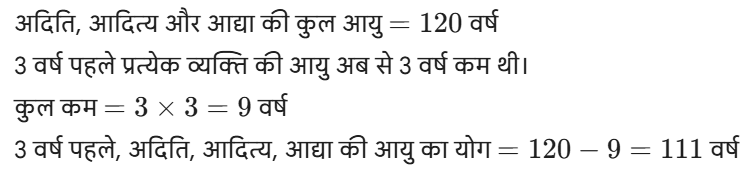 आयु Part-3Total Questions: 671. X, Y और Z की वर्तमान औसत आयु 44 वर्ष है। 8 वर्ष पहले X और Y की औसत आयु 38 वर्ष थी। Z की वर्तमान आयु कितनी है? [Level 5 (12/06/2022) Shift 1](a) 39 वर्ष (b) 38 वर्ष (c) 41 वर्ष (d) 40 वर्षCorrect Answer: (d) 40 वर्षSolution:2. पाँच साल पहले, A, B और C की औसत आयु 17 वर्ष थी। सात वर्ष पहले, A और B की औसत आयु 17 1/2 वर्ष थी। अब से 2 वर्ष बाद C की आयु (वर्ष में) क्या होगी? [Level 3 (14/06/2022) Shift 2](a) 19 (b) 20½(c) 20 (d) 18½Correct Answer: (a) 19 Solution:3. किसी कक्षा में 34 लड़कों की औसत आयु 12 वर्ष है। यदि शिक्षक की आयु को भी गणना में शामिल कर लिया जाए, तो औसत आयु में 1 वर्ष की वृद्धि हो जाती है। शिक्षक की आयु कितनी है? [Level 3 (17/06/2022) Shift 1 ](a) 45(b) 42(c) 44(d) 47Correct Answer: (d) 47Solution:4. 8 वर्ष में सुभाष की आयु अब की आयु की 3 गुनी हो जाएगी। कितने वर्ष बाद सुभाष की आयु अब की आयु से 5 गुनी हो जाएगी? [RRB NTPC 19/01/2021 (Evening)](a) 24 (b) 30 (c) 16(d) 20Correct Answer: (c) 16Solution:5. शिव कुमार और दिलीप कुमार की वर्तमान आयु 9 : 10 के अनुपात में है। 11 वर्ष बाद यह अनुपात 10 : 11 हो जाएगा। शिव कुमार और दिलीप कुमार की वर्तमान आयु क्या है? [RRB NTPC 23/01/2021 (Evening)](a) 81 वर्ष और 90 वर्ष(b) 54 वर्ष और 60 वर्ष(c) 72 वर्ष और 80 वर्ष(d) 99 वर्ष और 110 वर्षCorrect Answer: (d) 99 वर्ष और 110 वर्षSolution:6. सुजाता की वर्तमान आयु का तीन गुना, वनिता की वर्तमान आयु के दो गुने से 5 वर्ष अधिक है। 3 वर्ष बाद, वनिता की आयु का तीन गुना, सुजाता की आयु के चार गुने से 4 वर्ष कम होगा। वनिता की आयु, सुजाता से k वर्ष की आयु अधिक है। k का मान ज्ञात कीजिए। [RRB NTPC 25/01/2021 (Morning)](a) 7 (b) 4(c) 9 (d) 3Correct Answer: (b) 4Solution:7. दस वर्ष पहले, X की आयु 5 वर्ष थी और उसकी आयु Y की आयु की आधी थी। उस समय, Z अपने भाई P से 8 वर्ष छोटा था। Z उस समय 18 वर्ष का था। वर्तमान में Z और P की संबंधित आयु का अनुपात कितना है? [RRB NTPC 25/01/2021 (Evening)](a) 7 : 9 (b) 9 : 7 (c) 14 : 19 (d) 4 : 5Correct Answer: (a) 7 : 9 Solution:8. अदिति, आदित्य और आध्या की वर्तमान आयु का योग 120 वर्ष है। तीन वर्ष पूर्व उनकी आयु का योग कितना था? [RRB NTPC 31/01/2021 (Morning)](a) 111 (b) 118 (c) 114 (d) 112Correct Answer: (a) 111 Solution:9. जॉन की आयु जीन से दोगुनी है। 3 वर्ष बाद, आयु का योग 66 वर्ष होगा। जीन और जॉन की वर्तमान आयु क्रमशः क्या है? [RRB NTPC 31/01/2021 (Evening)](a) 40 और 20 साल(b) 42 और 84 वर्ष(c) 20 और 40 साल(d) 24 और 48 वर्षCorrect Answer: (c) 20 और 40 सालSolution:10. नरेंद्र की माँ की उम्र नरेंद्र की चार गुना है। चार साल पहले, उसकी माँ की उम्र नरेंद्र की उम्र से छह गुना थी। उनकी वर्तमान आयु क्या है? [RRB NTPC 01/02/2021 (Evening)](a) 7 साल, 28 साल(b) 10 साल, 40 साल(c) 5 साल, 20 साल(d) 20 साल, 80 सालCorrect Answer: (b) 10 साल, 40 सालSolution:Submit Quiz1234567Next »