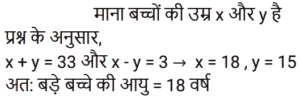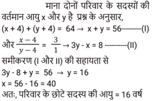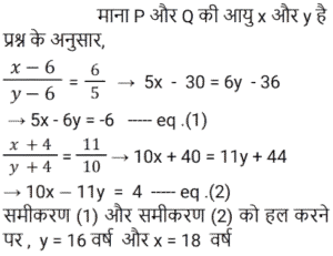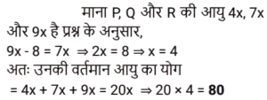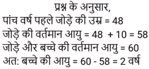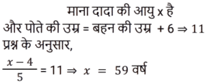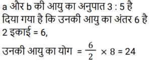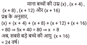 आयु Part-3Total Questions: 6721. P, Q और R की आयु 4 : 7 : 9 के अनुपात में है। 8 वर्ष पहले, R की आयु, Q की वर्तमान आयु के बराबर थी। वर्तमान में उनकी आयु का योग कितना है? [RRB JE 24/05/2019 (Evening)](a) 60 (b) 100 (c) 50 (d) 80Correct Answer: (d) 80Solution:22. 4 वर्ष के अंतराल पर पैदा होने वाले 5 बच्चों की आयु का योग 80 है। सबसे बड़े बच्चे की आयु कितनी है? [RRB JE 26/05/2019 (Morning)](a) 16 (b) 18 (c) 28 (d) 24Correct Answer: (d) 24Solution:23. 4 व्यक्तियों की औसत आयु 42 वर्ष है। यदि उनकी आयु क्रमशः 1 : 3 : 4 : 6 के अनुपात में है, तो सबसे अधिक और सबसे कम आयु के व्यक्ति की आयु का अंतर ज्ञात कीजिए। [RRB JE 26/05/2019 (Afternoon)](a) 60 वर्ष (b) 59 वर्ष (c) 61 वर्ष (d) 70 वर्षCorrect Answer: (a) 60 वर्ष Solution:24. छह वर्ष पहले P और Q की आयु का अनुपात 6 : 5 था। चार वर्ष बाद, यह अनुपात 11 : 10 हो जाएगा। P की वर्तमान आयु क्या है? [RRB JE 30/05/2019 (Morning)](a) 15 वर्ष (b) 18 वर्ष(c) 25 वर्ष (d) 20 वर्षCorrect Answer: (b) 18 वर्षSolution:25. A और B की आयु का अंतर 6 है और उनका अनुपात 3 : 5 है। उनकी आयु का योग ज्ञात कीजिए। [RRB JE 31/05/2019 (Evening)](a) 24 (b) 40 (c) 16 (d) 32Correct Answer: (a) 24 Solution:26. यदि किसी व्यक्ति की आयु से 4 वर्ष घटाए जाते हैं और 5 से विभाजित किया जाता है, तो परिणाम उसके पोते की आयु को दर्शाता है। पोते की एक बहन है, जिसकी आयु 5 वर्ष है, पोते से छह वर्ष छोटी है। दादा की आयु क्या है? [RRB JE 31/05/2019 (Evening)](a) 58 (b) 57 (c) 60 (d) 59Correct Answer: (d) 59Solution:27. दो भाइयों की आयु का अंतर 7 है और अनुपात 3 : 2 है। उनकी आयु का योग ज्ञात कीजिए। [RRB JE 01/06/2019 (Morning)](a) 21 (b) 42 (c) 35(d) 45Correct Answer: (c) 35Solution:28. चार वर्ष बाद एक परिवार के दो सदस्यों की कुल आयु 64 वर्ष होगी। चार वर्ष पहले उनकी आयु का अनुपात 3 : 1 था। उन दोनों में से छोटे वाले की आयु ज्ञात कीजिए। [RRB JE 01/06/2019 (Afternoon)](a) 10 (b) 16(c) 12 (d) 15Correct Answer: (b) 16Solution:29. दो बच्चों की आयु का योग और अंतर क्रमशः 33 और 3 है। बड़े बच्चे की आयु कितनी है? [RRB JE 01/06/2019 (Afternoon)](a) 15 वर्ष (b) 16 वर्ष (c) 18 वर्ष(d) 24 वर्षCorrect Answer: (c) 18 वर्षSolution:30. पांच वर्ष पहले एक जोड़े की औसत आयु 24 थी। वर्तमान में, जोड़े और एक बच्चे की आयु का औसत 20 है। बच्चे की आयु कितनी है? [RRB JE 01/06/2019 (Evening)](a) 1 वर्ष (b) 2 वर्ष(c) 4 वर्ष (d) 3 वर्षCorrect Answer: (b) 2 वर्षSolution:Submit Quiz« Previous1234567Next »