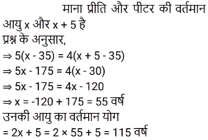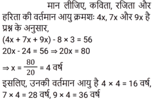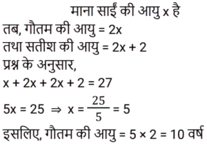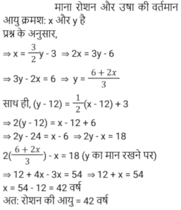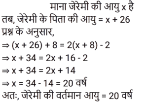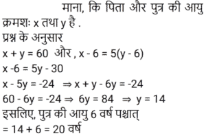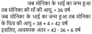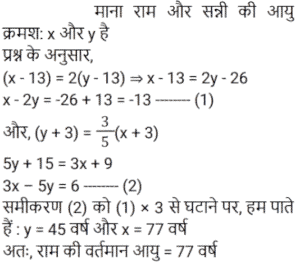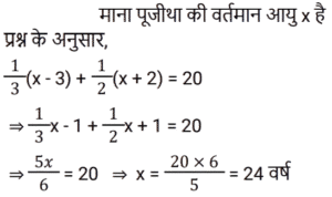 आयु Part-3Total Questions: 6751. पूनिथ की तीन वर्ष पहले की आयु के एक-तिहाई और वर्तमान आयु से दो वर्ष बाद की आयु के आधे का योग बीस वर्ष है। उसकी वर्तमान आयु क्या है? [RRB ALP 10/08/2018 (Evening)](a) 23 वर्ष(b) 26 वर्ष(c) 24 वर्ष(d) 25 वर्षCorrect Answer: (c) 24 वर्षSolution:52. पीटर और प्रीति के उम्रों में 5 वर्ष का अंतर है। 35 वर्ष पहले जब दोनों का विवाह हुआ था उस समय पीटर के उम्र का चार गुना, प्रीति के उम्र के 5 गुने के बराबर था। वर्तमान में दोनों के उम्रों का योग क्या है? [RRB ALP 13/08/2018 (Morning)](a) 105 वर्ष(b) 112 वर्ष(c) 115 वर्ष(d) 110 वर्षCorrect Answer: (c) 115 वर्षSolution:53. 13 वर्ष पहले राम की उम्र सनी की उम्र की दोगुनी थी। वर्तमान से तीन वर्ष के बाद सनी की उम्र राम की उम्र के 3/5 होगी। राम की वर्तमान उम्र क्या है? [RRB ALP 13/08/2018 (Morning)](a) 72 वर्ष(b) 77 वर्ष(c) 64 वर्ष(d) 80 वर्षCorrect Answer: (b) 77 वर्षSolution:54. रोशन की वर्तमान उम्र उषा की वर्तमान उम्र के 1.5 गुने से 3 वर्ष कम है। 12 वर्ष पहले उषा की उम्र रोशन की उम्र के आधे से 3 वर्ष ज्यादा थी। रोशन की वर्तमान उम्र क्या है? [RRB ALP 14/08/2018 (Afternoon)](a) 42(b) 33(c) 39(d) 30Correct Answer: (a) 42Solution:55. राम के पिता की उम्र राम के उम्र की दोगुनी है। 8 वर्ष पहले राम के पिता की उम्र राम के उम्र की 2.5 गुनी थी। राम की वर्तमान उम्र क्या है? [RRB ALP 14/08/2018 (Afternoon)](a) 25 वर्ष(b) 24 वर्ष(c) 23 वर्ष(d) 22 वर्षCorrect Answer: (b) 24 वर्षSolution:56. एक पिता और उसके पुत्र की वर्तमान आयु का योग 60 वर्ष है। छह वर्ष पहले, पिता की आयु पुत्र की आयु का पाँच गुना थी। 6 वर्ष बाद पुत्र की आयु कितनी होगी? [RRB ALP 20/08/2018 (Morning)](a) 21 वर्ष(b) 19 वर्ष(c) 15 वर्ष(d) 20 वर्षCorrect Answer: (d) 20 वर्षSolution:57. मोनिका के पिता की आयु मोनिका के जन्म के समय 38 वर्ष थी, जबकि उसकी माँ की आयु उस समय 36 वर्ष थी, जब उसके चार वर्ष छोटे भाई का जन्म हुआ था। उनके माता-पिता की आयु के बीच अंतर क्या है? [RRB ALP 20/08/2018 (Morning)](a) 3 वर्ष(b) 6 वर्ष(c) 4 वर्ष(d) 2 वर्षCorrect Answer: (b) 6 वर्षSolution:58. कविता, रजिता और हरिता की वर्तमान आयु का अनुपात 4 : 7 : 9 है। आठ वर्ष पहले, उनकी आयु का योग 56 था। उनकी वर्तमान आयु (वर्ष में) ज्ञात कीजिए। [RRB ALP 20/08/2018 (Evening)](a) 12, 21, 27(b) 20, 35, 45(c) 16, 36, 28(d) 16, 28, 36Correct Answer: (d) 16, 28, 36Solution:59. सतीश की आयु गौतम से दो वर्ष अधिक है, जिसकी आयु साई की आयु से दो गुना है। यदि सतीश, गौतम और साई की आयु का कुल योग 27 है, तो गौतम की आयु कितनी है? [RRB ALP 20/08/2018 (Evening)](a) 13(b) 11(c) 12(d) 10Correct Answer: (d) 10Solution:60. जेरेमी अपने पिता से 26 वर्ष छोटा है। वर्तमान से 8 वर्ष बाद उसके पिता की उम्र उसके स्वयं की उम्र के दोगुने से दो वर्ष कम होगी। जेरेमी की वर्तमान उम्र क्या है (वर्षों में)? [RRB ALP 21/08/2018 (Afternoon)](a) 18(b) 20(c) 24(d) 22Correct Answer: (b) 20Solution:Submit Quiz« Previous1234567Next »