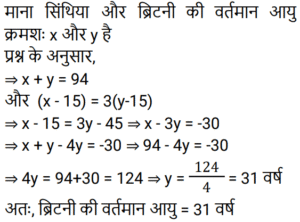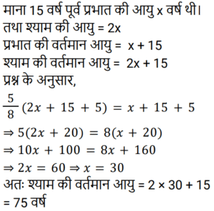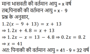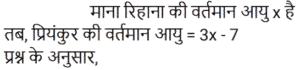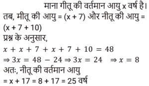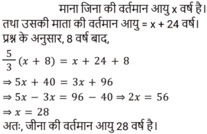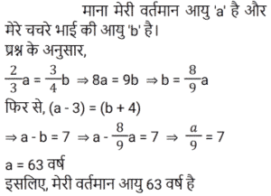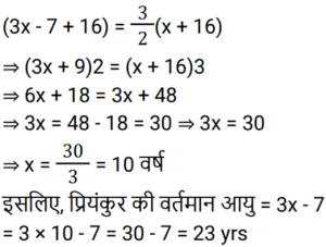 आयु Part-3Total Questions: 6761. मेरी वर्तमान उम्र का दो-तिहाई मेरे चचेरे भाई के उम्र के तीन-चौथाई के बराबर है। तीन वर्ष पहले की मेरी उम्र मेरे चचेरे भाई की आज से चार वर्ष बाद के उम्र के बराबर होगी। मेरी वर्तमान उम्र क्या है? [RRB ALP 29/08/2018 (Morning)](a) 63(b) 81(c) 54(d) 72Correct Answer: (a) 63Solution:62. प्रियंकर की वर्तमान आयु उसकी चचेरी बहन रिहाना की आयु के तीन गुना से सात वर्ष कम है। अब से सोलह वर्ष बाद, प्रियंकर की आयु रिहाना की आयु की 150% होगी। प्रियंकर की वर्तमान आयु (वर्षों में) कितनी है? [RRB ALP 29/08/2018 (Evening)](a) 20(b) 17(c) 23(d) 26Correct Answer: (c) 23Solution:63. 15 साल पहले सिंध्या, ब्रिटनी से 3 गुना बड़ी थी। उनकी वर्तमान आयु का योग 94 वर्ष है। ब्रिटनी अब कितनी बड़ी है? [RRB ALP 30/08/2018 (Morning)](a) 33 वर्ष(b) 30 वर्ष(c) 31 वर्ष(d) 32 वर्षCorrect Answer: (c) 31 वर्षSolution:64. जीना अपनी माँ से 24 वर्ष छोटी है। आठ वर्ष के बाद उसकी माँ की आयु उसकी आयु की 5/3 गुना हो जाएगी। जीना की वर्तमान आयु (वर्षों में) कितनी है? [RRB ALP 30/08/2018 (Evening)](a) 28(b) 22(c) 26(d) 24Correct Answer: (a) 28Solution:65. पिनाकी, भास्वती से 9 वर्ष छोटी है। तेरह वर्ष के बाद भास्वती की आयु पिनाकी की आयु की 1.2 गुना होगी। पिनाकी की वर्तमान आयु पता करें? [RRB ALP 31/08/2018 (Morning)](a) 30 वर्ष(b) 33 वर्ष(c) 28 वर्ष(d) 32 वर्षCorrect Answer: (d) 32 वर्षSolution:66. 15 साल पहले, श्याम प्रभात की तुलना में दोगुनी आयु का था। अब से पांच साल बाद प्रभात की उम्र श्याम की उम्र की 5/8 होगी। श्याम की वर्तमान उम्र क्या है? [RRB ALP 31/08/2018 (Evening)](a) 80 साल(b) 72 साल(c) 64 साल(d) 75 सालCorrect Answer: (d) 75 सालSolution:67. नीतू की आयु मीतू की आयु से 10 वर्ष अधिक है, और मीतू की आयु गीत की आयु से 7 वर्ष अधिक है। यदि उनकी आयु का योग 48 वर्ष है, तो नीतू की आयु (वर्ष में) कितनी है? [RRB ALP 30/08/2018 (Evening)](a) 22(b) 27(c) 28(d) 25Correct Answer: (d) 25Solution:Submit Quiz« Previous1234567