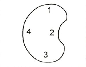 34. निम्नांकित चित्र में दाएं मानव वृक्क को दर्शाया गया है। मूत्रवाहिनी किस बिंदु पर वृक्क से बाहर निकलती है? [RRC Group D 29/09/2022 (Morning)]