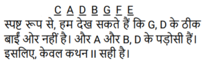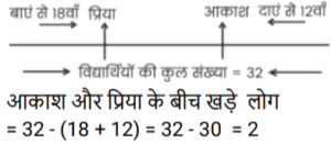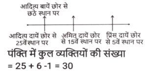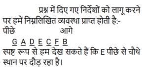 ऑर्डर और रैंकिंग (भाग-II)Total Questions: 3911. एक ट्यूशन क्लास के सात छात्रों, पंछी, काज़ी, रिकी, स्वेता, टिया, उरुशा और विनय द्वारा प्राप्त अंकों का उल्लेख किया गया है। पंछी कक्षा में दूसरे स्थान पर आई। विनय द्वारा प्राप्त अंक केवल एक व्यक्ति से अधिक थे। स्वेता के अंक टिया के अंकों से अधिक थे लेकिन पंछी के अंकों से कम थे। तीन छात्रों ने टिया से अधिक अंक प्राप्त किए और तीन छात्रों ने टिया से कम अंक प्राप्त किए। न तो रिकी और न ही काजी ने सबसे कम अंक प्राप्त किए। यह देखते हुए कि किसी भी दो छात्रों के अंक समान नहीं हैं, किसके अंक सबसे कम थे? [SSC CHSL 17/03/2023 (1st Shift)](a) रिकी(b) उरुशा(c) विनय(d) टियाCorrect Answer: (b) उरुशाSolution:रिक्की / क़ाज़ी > पंछी > स्वेता > टिया > रिक्की / क़ाज़ी > विनय > उरुशा12. सात बहनों T, U, V, W, X, Y Z में; U केवल चार अन्य बहनों से बड़ी है। V, W से बड़ी है। T, Y से बड़ी है। × केवल एक बहन से बड़ी है, वह Z है जो सभी बहनों में सबसे छोटी है। U, T से बड़ी है। यह देखते हुए कि कोई भी दो बहनों की आयु समान नहीं है, ज्ञात कीजिए कि सबसे बड़ी बहन कौन है। [SSC CHSL 20/03/2023 (3rd Shift)](a) X(b) V(c) U(d) WCorrect Answer: (b) VSolution:V > W > U > T > Y > X > Z V सबसे बड़ी बहन है।13. एक कक्षा में सभी 32 विद्यार्थी एक पंक्ति में उत्तर की ओर अभिमुख होकर खड़े हैं। आकाश दायें छोर से 12वें स्थान पर है जबकि प्रिया बाएं छोर से 18वें स्थान पर है। आकाश और प्रिया के बीच कितने लोग खड़े हैं? [SSC CGL Tier II (02/03/2023)](a) दो(b) चार(c) तीन(d) पाँचCorrect Answer: (a) दोSolution:14. उत्तर की ओर अभिमुख लोगों की एक पंक्ति में, प्रिंस दायें छोर से 5वें स्थान पर है। अमित दायें छोर से 15वें स्थान पर है। अमित, प्रिंस और आदित्य के ठीक बीच में है। यदि आदित्य पंक्ति के बायें छोर से छठे स्थान पर है, तो पंक्ति में कितने व्यक्ति हैं? [SSC CGL Tier II (03/03/2023)](a) 29(b) 31(c) 30(d) 32Correct Answer: (c) 30Solution:15. 4 मित्र A, B, C और D एक सीधी रेखा में खड़े हैं, हालांकि यह जरूरी नहीं कि वे इसी क्रम में हों A और B कम से कम 1 व्यक्ति के आगे हैं। B, C और D के बीच में खड़ा है। D सबसे अंत में नहीं खड़ा है। पहले स्थान पर कौन खड़ा है ? [SSC CGL Tier II (06/03/2023)](a) A(b) B(c) C(d) DCorrect Answer: (a) ASolution:16. अमित अपनी कक्षा में ऊपर से 7वें और नीचे से 26वें स्थान पर है। कक्षा में कितने छात्र हैं? [SSC CGL Tier II (07/03/2023)](a) 31(b) 33(c) 27(d) 32Correct Answer: (d) 32Solution:कक्षा में कुल छात्र = 7 + 26 - 1 = 3217. सात धावक (एथलीट) A, B, C, D, E, F और G एक दौड़ में भाग लेते हैं। E, A से आगे है किंतु F से पीछे है। D केवल दो धावकों (एथलीट्स) से आगे हैं। G सबसे पीछे दौड़ रहा है। C केवल दो धावकों (एथलीट्स) से पीछे दौड़ रहा है। F पहले स्थान पर नहीं है। कौन सा धावक (एथलीट) पीछे से चौथे स्थान पर दौड़ रहा है? [SSC MTS 05/07/2022 (Morning)](a) C(b) E(c) A(d) DCorrect Answer: (b) ESolution:18. पांच बहनों, सीता, गीता, बबिता, ललिता और अनीता की आयु की तुलना की गई। गीता, बबिता से बड़ी है किन्तु सीता से छोटी है। ललिता सबसे बड़ी है। बबिता सबसे छोटी नहीं है। दूसरी सबसे बड़ी बहन कौन है? [SSC MTS 05/