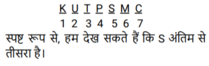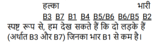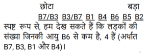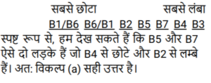 ऑर्डर और रैंकिंग (भाग-II)Total Questions: 3921. सात लड़कों B1, B2, B3, B4, B5, B6 को और B7 के भारों की तुलना की गई है। B5 का भार केवल एक लड़के से कम है और B6 से अधिक है। B4 का भार B6 के भार से न तो अधिक है और न ही कम है, किंतु B1, B7 और B3 से अधिक है। किसका भार सबसे अधिक है? [SSC MTS 06/07/2022 (Morning)](a) B5(b) B2(c) B6(d) B1Correct Answer: (b) B2Solution:न्यूनतम अधिकतम __ __ __ __ __ B5 B2 पहले पांच पदों पर B1, B7, B3, B4, B6 के द्वारा ग्रहण किया जाता है तो हम कह सकते हैं कि सबसे ज्यादा वजन B2 का है तो, विकल्प (b) सही उत्तर है।22. सात लड़कों B1, B2, B3, B4, B5, B6 और B7 की ऊँचाइयों की तुलना की गई है। उन सभी की ऊँचाइयाँ भिन्न भिन्न हैं। B2, B1 और B6 से ऊँचा है। B7, B3 और B4 से छोटा है किंतु B5 से ऊँचा है। B5 केवल तीन लड़कों से ऊँचा है और B3 सबसे ऊँचा है। कितने लड़के B4 से छोटे और B2 से ऊँचे हैं? [SSC MTS 06/07/2022 (Evening)](a) 2(b) 1(c) 4(d) 3Correct Answer: (a) 2Solution:23. 7 लड़कों B1, B2, B3, B4, B5, B6 और B7 के IQ का परीक्षण किया जाता है और परिणाम की तुलना की जाती है। B2 का IQ, B6 से अधिक है। B5 का IQ तीसरा सबसे कम है। B4 का IQ, 6 लड़कों से अधिक है। B3 का IQ, B2 से कम है। B1 का IQ, B2 से अधिक है। B7 का IQ सबसे कम है। दूसरा उच्चतम IQ किसका है? [SSC MTS 07/07/2022 (Morning)](a) B2(b) B7(c) B1(d) B3Correct Answer: (c) B1Solution:24. सात लड़के M, K, C, P, S, T और U एक प्रतियोगिता में भाग लेते हैं। ये सभी 1 से 7 तक अलग-अलग रैंकों पर हैं, 1 उच्चतम और 7 निम्नतम है। S की रैंक K से कम है, लेकिन C से अधिक है। T की रैंक U से एक कम और P से एक अधिक है। U की दूसरी सर्वोच्च रैंक है। S की रैंक केवल चार लड़कों से कम है। C की रैंक सबसे कम है। अंतिम से तीसरे स्थान पर किसकी रैंक है ? [SSC MTS 07/07/2022 (Evening)](a) P(b) K(c) S(d) TCorrect Answer: (c) SSolution:25. सात लड़कों B1, B2, B3, B4, B5, B6 कों और B7 की आयु की तुलना की गई है। सभी लड़कों की आयु भिन्न है। B4 की आयु तीन लड़कों से कम है। B1 की आयु केवल B7 और B3 से अधिक है। B5 की आयु B6 से अधिक किंतु B2 से कम है। कितने लड़कों की आयु B6 से कम है? [SSC MTS 08/07/2022 (Morning)](a) 2(b) 1(c) 3(d) 4Correct Answer: (d) 4Solution:26. सात लड़कों B1, B2, B3, B4, B5, B6 कों और B7 के भारों की तुलना की गई है। किन्हीं भी दो लड़कों का भार समान नहीं है। B4 का भार केवल तीन लड़कों से कम है। B1 का भार B7 से अधिक है। B2 का भार सबसे अधिक है। B5 और B6, दोनों का भार B1 सेअधिक है। B3 का भार B7 से कम है। कितने लड़कों का भार B1 से कम है? [SSC MTS 08/07/2022 (Afternoon)](a) 4(b) 3(c) 1(d) 2Correct Answer: (d) 2Solution:27. सात शिक्षक M, N, O, P, Q, R और S अलग-अलग संख्या में ट्यूशन लेते हैं। P, S से अधिक ट्यूशन लेता है। M, Q से अधिक ट्यूशन लेता है। R, दूसरी सबसे बड़ी संख्या में ट्यूशन लेता है। ० के ट्यूशनों की संख्या, केवल चार शिक्षकों के ट्यूशन से कम है। N, P से कम ट्यूशन लेता है लेकिन M से अधिक ट्यूशन लेता है। Q सबसे कम ट्यूशन लेता है। S, दूसरी सबसे कम संख्या में ट्यूशन लेता है। ली गई ट्यूशनों की संख्या के संदर्भ में, N और S के बीच में कौन है? [SSC MTS 08/07/2022 (Evening)](a) R, Q(b) P, M(c) O, P(d) M, OCorrect Answer: (d) M, OSolution:28. यहाँ पाँच छात्राओं आकृति, किरण, लीसा, मनीषा और रेखा के कद की तुलना की गई है। किरण केवल दो छात्रों से ऊँची है। मनी