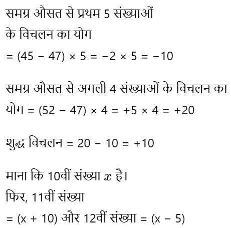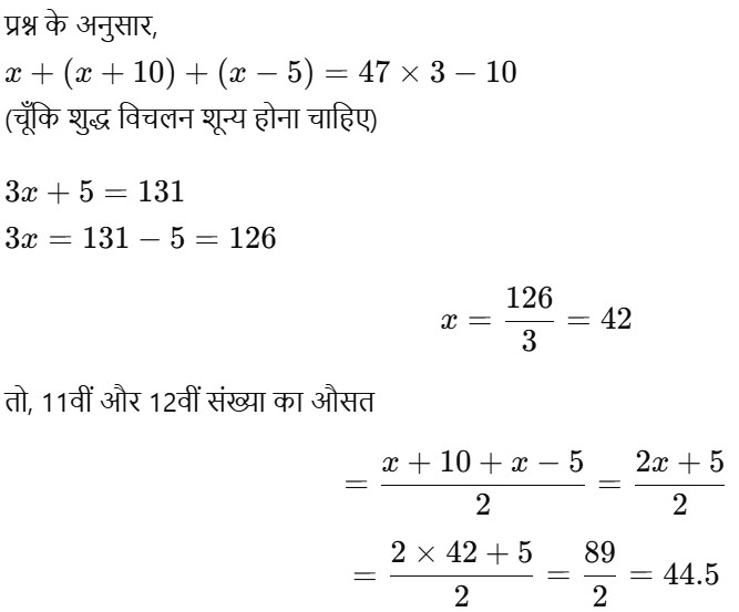 44. 12 संख्याओं का औसत 47 है। पहली 5 संख्याओं का औसत 45 है और अगली 4 संख्याओं का औसत 52 है। यदि 10वीं संख्या, 11वीं संख्या से 10 कम है और 12वीं संख्या से 5 अधिक है, तो 11 वीं और 12वीं संख्याओं का औसत क्या होगा? [Graduate Level 20/06/2024 (Shift-3)]