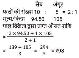45. एक फल विक्रेता के पास 10 kg सेब और 5 kg अंगूर हैं। 1 kg सेब की कीमत ₹94.50 और 1 kg अंगूर की कीमत ₹105 है। उसने अपने सारे फल बेच दिए। फल विक्रेता को प्राप्त औसत राशि (₹ में) ज्ञात करें। [Graduate Level 21/06/2024 (Shift-3)]