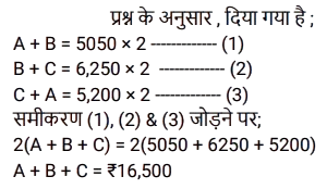 49. A और B की औसत मासिक आय ₹5,050 है, B और C की औसत मासिक आय ₹6,250 है, और A और C की औसत मासिक आय ₹5,200 है। A, B और C की मासिक आय का योग (₹ में) कितना है ? [Graduate Level 25/06/2024 (Shift-3)]