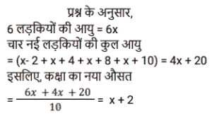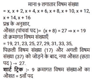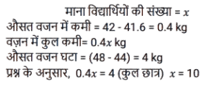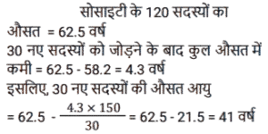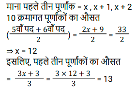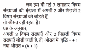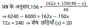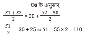 औसत (SSC) (Part-IV)Total Questions: 5041. 40 छड़ियों की औसत ऊँचाई 156 cm है। 162 cm औसत ऊँचाई की कुछ छड़ियों को निकाल दिया जाता है। यदि छड़ियों की नई औसत ऊँचाई 150 cm है, तो कितनी छड़ियाँ शेष बची हैं? [SSC MTS 10/05/2023 (Afternoon)](a) 25(b) 20(c) 16(d) 32Correct Answer: (b) 20Solution:42. एक पंक्ति में बैठे चार छात्रों में से अंतिम तीन छात्रों की औसत आयु 48 वर्ष है और पहले तीन छात्रों की औसत आयु 50 वर्ष है। यदि पहले छात्र की आयु 56 वर्ष है, तो अंतिम छात्र की आयु कितनी है ? [SSC MTS 15/05/2023 (Afternoon)](a) 30(b) 40(c) 50(d) 60Correct Answer: (c) 50Solution:43. छात्रों के एक समूह का औसत भार 42 kg है। 48 kg भार वाला एक छात्र समूह छोड़ देता है और 44 kg भार वाला एक अन्य छात्र समूह में शामिल हो जाता है। यदि नया औसत भार 41.6 kg हो जाता है, तो समूह में कितने छात्र हैं? [SSC MTS 13/06/2023 (Afternoon)](a) 15(b) 10(c) 8(d) 12Correct Answer: (b) 10Solution:44. 7 क्रमागत विषम संख्याओं का औसत A है। यदि अगली 3 और पिछली 2 विषम संख्याओं को भी इन 7 विषम संख्याओं में शामिल कर लिया जाए, तो इन 12 क्रमागत विषम संख्याओं का नया औसत क्या है? [SSC MTS 16/06/2023 (Morning)](a) A+1(b) A-2(c) A+2(d) A +3Correct Answer: (a) A+1Solution:45. S1 और S2 द्वारा प्राप्त अंकों का औसत S2 और S3 द्वारा प्राप्त औसत अंकों से 30 अधिक है। यदि S3 द्वारा प्राप्त अंक 50 हैं, तो S1 द्वारा प्राप्त अंक कितने हैं? [ SSC MTS 19/06/2023 (Morning)](a) 80(b) 105(c) 95(d) 110Correct Answer: (d) 110Solution:46. एक सोसाइटी के 120 सदस्यों की औसत आयु 62.5 वर्ष है। 30 नए सदस्यों को शामिल करने पर औसत आयु 58.2 वर्ष हो जाती है। नए शामिल हुए सदस्यों की औसत आयु कितनी है? [SSC CHSL 09/03/2023 (2nd Shift)](a) 40 वर्ष(b) 41 वर्ष(c) 39 वर्ष(d) 42 वर्षCorrect Answer: (b) 41 वर्षSolution:47. 6 लड़कियों की एक कक्षा की औसत आयु × वर्ष है। x - 2, x + 4, x + 8 और x + 10 आयु वाली चार नई लड़कियाँ कक्षा में शामिल होती हैं। कक्षा की नई औसत आयु क्या है? [SSC CHSL 09/03/2023 (3rd Shift)](a) x - 2(b) x + 2(c) x + 5(d) x + 1Correct Answer: (b) x + 2Solution:48. 9 क्रमबद्ध विषम संख्याओं का औसत 27 है। यदि इन 9 विषम संख्याओं की पिछली और अगली विषम संख्या को भी शामिल कर लिया जाए, तो नया औसत क्या होगा? [SSC CHSL 09/03/2023 (4th Shift)](a) 32(b) 28(c) 29(d) 27Correct Answer: (d) 27Solution:49. 10 क्रमागत पूर्णांकों का औसत 33/2 है। पहले तीन पूर्णांकों का औसत क्या है? [SSC CHSL 13/03/2023 (1st Shift)](a) 12(b) 13(c) 15(d) 11Correct Answer: (b) 13Solution:50. 2 वर्ष पूर्व पति, पत्नी और बच्चे की औसत आयु 28 वर्ष थी, तथा 5 वर्ष पूर्व पति और बच्चे की औसत आयु 21 वर्ष थी। पत्नी की वर्तमान आयु कितनी है ? [SSC CHSL 13/03/2023 (3rd Shift)](a) 38 वर्ष(b) 40 वर्ष(c) 36 वर्ष(d) 42 वर्षCorrect Answer: (a) 38 वर्षSolution:Submit Quiz« Previous12345
