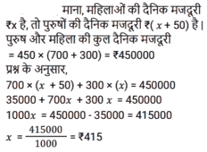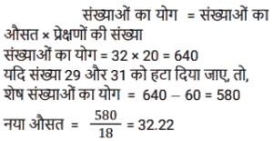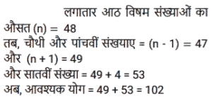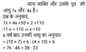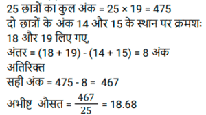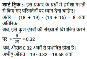 औसत (SSC) (Part-V)Total Questions: 5011. X और Y द्वारा प्राप्त अंकों का औसत, Y और Z द्वारा प्राप्त औसत अंकों से 35 कम है। यदि Z द्वारा प्राप्त अंक 85 हैं, तो X द्वारा प्राप्त अंक क्या हैं? [SSC CHSL 21/03/2023 (3rd Shift)](a) 155(b) 15(c) 35(d) 25Correct Answer: (b) 15Solution:12. प्रथम पाँच प्राकृतिक संख्याओं के घनों का औसत ज्ञात कीजिए। [SSC CGL Tier II (02/03/2023)](a) 35(b) 40(c) 45(d) 50Correct Answer: (c) 45Solution:13. 20 संख्याओं का औसत 32 है। यदि दो संख्याएँ 29 और 31 हैं, तो शेष संख्याओं का औसत क्या है (दशमलव के दो स्थानों तक सही उत्तर दें)? [SSC CGL Tier II (03/03/2023)](a) 31.24(b) 30.22(c) 34.44(d) 32.22Correct Answer: (d) 32.22Solution:14. एक परीक्षा में एक कक्षा में 25 छात्रों के अंकों का औसत 19 था। बाद में, शिक्षक को पता चला कि दो छात्रों के अंक 14 और 15 के बजाय गलती से क्रमशः 18 और 19 लिए गए थे। कक्षा का नया वास्तविक औसत अंक ज्ञात कीजिए । [SSC CGL 01/12/2022 (2nd Shift)](a) 17.43(b) 16.56(c) 18.68(d) 17.65Correct Answer: (c) 18.68Solution:15. एक कंपनी ने 700 पुरुषों और 300 महिलाओं को रोजगार दिया और औसत वेतन ₹ 450 प्रति दिन था। यदि एक पुरुष को एक महिला की तुलना में ₹50 अधिक प्राप्त होते हैं, तो एक महिला का दैनिक वेतन क्या होगा? [SSC CGL 03/12/2022 (3rd Shift)](a) Rs.350(b) Rs.375(c) Rs.415(d) Rs.435Correct Answer: (c) Rs.415Solution:16. आठ क्रमागत विषम संख्याओं का औसत 48 है। पाँचवीं और सातवीं संख्याओं का योग ज्ञात कीजिए । [SSC CGL 06/12/2022 (3rd Shift)](a) 102(b) 86(c) 89(d) 90Correct Answer: (a) 102Solution:17. किसी टोकरी में रखे सेबों का औसत भार 50 kg है। उस टोकरी में 60 kg औसत भार वाले 6 और सेब मिलाए जाते हैं। यदि टोकरी के सेबों के औसत भार में 5 kg की वृद्धि होती है, तो टोकरी में प्रारंभ में रखे सेबों की संख्या ज्ञात कीजिए। [SSC CGL 07/12/2022 (4th Shift)](a) 4(b) 6(c) 2(d) 8Correct Answer: (b) 6Solution:18. एक छात्र के अंक 45 के स्थान पर गलती से 65 दर्ज कर दिए गए। इसके कारण कक्षा के औसत अंक में 1/3 की वृद्धि हो गई। कक्षा में छात्रों की संख्या ___________है। [SSC CGL 08/12/2022 (3rd Shift)](a) 40(b) 20(c) 60(d) 30Correct Answer: (c) 60Solution:19. यदि s संख्याओं का औसत r⁴ और r संख्याओं का औसत s⁴ है, तो सभी r + s संख्याओं का औसत ज्ञात कीजिए। [SSC CGL 09/12/2022 (4th Shift)](a) rs(r² + s² - rs)(b) rs(c) r²+ s²(d) rs(r² + s²)Correct Answer: (a) rs(r² + s² - rs)Solution:20. एक व्यक्ति और उसके पुत्र की औसत आयु 55 वर्ष है। उनकी आयु का अनुपात क्रमशः 7 : 4 है। 6 वर्ष बाद उनकी आयु का अनुपात क्या होगा? [SSC CGL 12/12/2022 (2nd Shift)](a) 1 : 2(b) 12 : 7(c) 25 : 17(d) 38 : 23Correct Answer: (d) 38 : 23Solution:Submit Quiz« Previous12345Next »