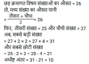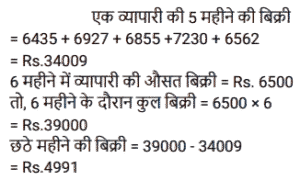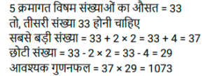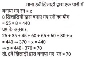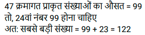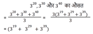 औसत (SSC) (Part-V)Total Questions: 5031. 3²⁰, 3³⁰, 3⁴⁰. का औसत ज्ञात कीजिए । [Graduate Level 03/08/2022 (Shift-3)](a) (3²⁰ + 3¹⁰ + 3⁴⁰(b) 3³⁰(c) (3²⁰ + 3³⁰ + 3⁴⁰)(d) (3¹⁹ + 3²⁹ + 3³⁹)Correct Answer: (d) (3¹⁹ + 3²⁹ + 3³⁹)Solution:32. पिछले पाँच महीनों में, एक व्यापारी ने Rs. 6,435, Rs. 6,927, Rs.6, 855, Rs. 7,230 और Rs.6,562 की बिक्री की है। Rs 6,500 की औसत बिक्री प्राप्त करने के लिए छठे महीने में उसे कितनी बिक्री करने की आवश्यकता है? [Higher Secondary 01/08/2022 (Shift-3)](a) Rs.4,781(b) Rs.4,991(c) Rs.4,810(d) Rs.5,021Correct Answer: (b) Rs.4,991Solution:33. एक छात्र को जीव-विज्ञान में 72 अंक, हिंदी में 84 अंक, गणित में 91 अंक, विज्ञान में 80 अंक और अंग्रेज़ी में 73 अंक (100 में से) प्राप्त हुए। उसके औसत अंक ज्ञात कीजिए । [Higher Secondary 03/08/2022 (Shift-4)](a) 65(b) 70(c) 60(d) 80Correct Answer: (d) 80Solution:34. X और Y का औसत 10X है। Y का मान ज्ञात कीजिए। [SSC MTS 05/07/2022 (Afternoon)](a) 16X(b) 9X(c) 18X(d) 19XCorrect Answer: (d) 19XSolution:35. छह क्रमागत विषम संख्याओं का औसत 26 है। इनमें से सबसे बड़ी और सबसे छोटी संख्याओं का अंतर ज्ञात कीजिए। [SSC MTS 05/07/2022 (Evening)](a) 8(b) 16(c) 10(d) 12Correct Answer: (c) 10Solution:36. 20 संख्याओं के समुच्चय का औसत P है। यदि इस समुच्चय में से किसी एक संख्या को 58 से बदल दिया जाए, तो औसत (P-2) हो जाता है। बदली गई संख्या का मान ज्ञात कीजिए। [SSC MTS 06/07/2022 (Morning)](a) 98(b) 94(c) 60(d) 104Correct Answer: (a) 98Solution:37. एक पारी में 8 खिलाड़ियों द्वारा बनाए गए रनों का औसत 55 है। यदि इन खिलाड़ियों में से 7 खिलाड़ियों द्वारा पारी में बनाए गए रन 25, 35, 45, 60, 65, 60 और 80 हैं, तो आठवें खिलाड़ी द्वारा उसी पारी में कितने रन बनाए गए हैं? [SSC MTS 06/07/2022 (Afternoon)](a) 65(b) 80(c) 75(d) 70Correct Answer: (d) 70Solution:38. पांच सदस्यों वाले परिवार की वर्तमान औसत आयु 24 वर्ष है। यदि परिवार में सबसे छोटे सदस्य की वर्तमान आयु 8 वर्ष है, तो इस सबसे छोटे सदस्य के जन्म से ठीक पहले परिवार के सदस्यों की औसत आयु क्या थी? [SSC MTS 07/07/2022 (Morning)](a) 24 वर्ष(b) 20 वर्ष(c) 28 वर्ष(d) 16 वर्षCorrect Answer: (b) 20 वर्षSolution:39. 47 क्रमागत प्राकृत संख्याओं का औसत 99 है। इन संख्याओं में सबसे बड़ी संख्या क्या है? [SSC MTS 07/07/2022 (Afternoon)](a) 122(b) 123(c) 121(d) 124Correct Answer: (a) 122Solution:40. 5 क्रमागत विषम संख्याओं का औसत 33 है। इन पाँच संख्याओं में से सबसे छोटी और सबसे बड़ी संख्याओं का गुणनफल क्या है? [SSC MTS 07/07/2022 (Evening)](a) 1147(b) 1237(c) 957(d) 1073Correct Answer: (d) 1073Solution:Submit Quiz« Previous12345Next »
