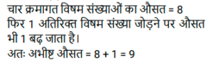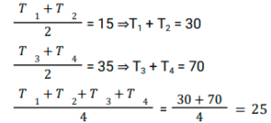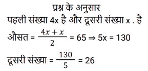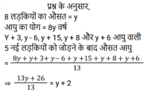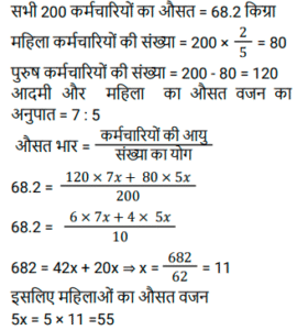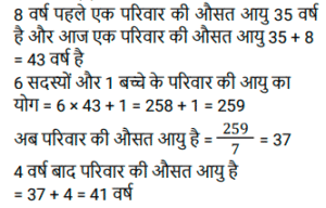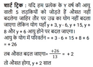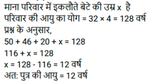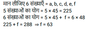 औसत (SSC) (Part-V)Total Questions: 5041. एक परिवार में चार लोग हैं। इन चारों सदस्यों की औसत आयु 32 वर्ष है। पिता की उम्र 50 वर्ष, मां की 46 वर्ष और बेटी की उम्र 20 वर्ष है। परिवार में इकलौते पुत्र की आयु (वर्ष) ज्ञात कीजिए। [SSC MTS 07/07/2022 (Evening)](a) 18(b) 16(c) 14(d) 12Correct Answer: (d) 12Solution:42. चार क्रमागत विषम संख्याओं का औसत 8 है। यदि इसमें अगली विषम संख्या को भी शामिल कर लिया जाए, तो इन पांच संख्याओं का नया औसत क्या होगा? [SSC MTS 08/07/2022 (Morning)](a) 9(b) 7(c) 10(d) 11Correct Answer: (a) 9Solution:43. रवि 5 पेन प्रति ₹150 में 2 पेंसिल प्रति ₹100 में और 3 नोटबुक प्रति ₹250 में खरीदता है। रवि द्वारा प्रति वस्तु का औसत व्यय कितना है ? [SSC MTS 08/07/2022 (Afternoon)](a) ₹180(b) ₹160(c) ₹170(d) ₹165Correct Answer: (c) ₹170Solution:44. एक कार्यालय में सभी 200 कर्मचारियों का औसत वजन 68.2 kg है जहां 2/5 कर्मचारी महिलाएं हैं और एक पुरुष और एक महिला के औसत वजन का अनुपात 7: 5 है। सभी महिला कर्मचारियों का औसत भार ज्ञात कीजिए। [SSC MTS 08/07/2022 (Evening)](a) 60 kg(b) 54 kg(c) 55 kg(d) 59 kgCorrect Answer: (c) 55 kgSolution:45. आठ लड़कियों की औसत आयु Y वर्ष है। 5 नई लड़कियां जिनकी आयु y + 3, y - 6 y + 15, y + 8 और y + 6 है कक्षा में शामिल होती हैं। तो कक्षा की नई औसत आयु (वर्ष) क्या है? [SSC MTS 11/07/2022 (Morning)](a) (y + 2)(b) (y + 6)(c) (y + 3)(d) (y + 1)Correct Answer: (a) (y + 2)Solution:46. दो संख्याएँ इस प्रकार हैं कि पहली संख्या दूसरी संख्या की चार गुनी है। यदि उनका औसत 65 है, तो दूसरी संख्या क्या है? [SSC MTS 12/07/2022 (Morning)](a) 26(b) 14(c) 24(d) 28Correct Answer: (a) 26Solution:47. 8 वर्ष पहले, राहुल के 6 सदस्यों वाले परिवार की औसत आयु 35 वर्ष थी। एक वर्ष पहले इस परिवार में एक नए बच्चे का जन्म हुआ था। चार वर्ष बाद परिवार की औसत आयु क्या होगी? [SSC MTS 12/07/2022 (Afternoon)](a) 41 वर्ष(b) 37 वर्ष(c) 40 वर्ष(d) 43 वर्षCorrect Answer: (a) 41 वर्षSolution:48. परीक्षा में तीन छात्रों द्वारा प्राप्त औसत अंक x है। यदि एक नए छात्र के अंकों को भी शामिल किया जाता है, तो औसत अंक 2 बढ़ जाते हैं। नए छात्र ने परीक्षा में कितने अंक प्राप्त किए हैं? [SSC MTS 13/07/2022 (Morning)](a) x + 4(b) x + 6(c) x + 8(d) x + 2Correct Answer: (c) x + 8Solution:49. T₁ और T₂ का औसत 15 है। T₃ और T₄ का औसत 35 है। T₁, T₂, T₃ और T₄ का औसत क्या है? [SSC MTS 13/07/2022 (Afternoon)](a) 24(b) 30(c) 28(d) 25Correct Answer: (d) 25Solution:50. पाँच संख्याओं का माध्य 45 है। यदि एक छठी संख्या भी शामिल कर ली जाए तो माध्य 48 हो जाता है। छठी संख्या ज्ञात कीजिए। [SSC MTS 13/07/2022 (Afternoon)](a) 73(b) 63(c) 43(d) 53Correct Answer: (b) 63Solution:Submit Quiz« Previous12345