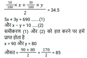9. मान लीजिए x और y दो धनात्मक संख्याएँ हैं इस प्रकार कि x > y. x के 50% और y के 30% का औसत 34.5 है। यदि x और y के बीच का अंतर 10 है, तो x और y का औसत है: [SSC MTS 27/10/2021 (Evening)]