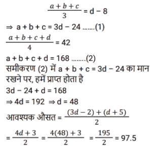 3. a, b और c का औसत d से 8 कम है। यदि a, b, c और d का औसत 42 है, तो (3d - 2) और (d + 5) का औसत क्या है? [SSC MTS 14/10/2021 (Afternoon)]