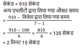 1. एक दौड़ में 7 एथलीटों द्वारा लिया गया औसत समय 2 मिनट 10 सेकंड है। यदि विजेता ने दौड़ 1 मिनट 40 सेकंड में पूरी की, तो अन्य एथलीटों द्वारा लिया गया औसत समय है: [SSC MTS 13/10/2021 (Afternoon)]