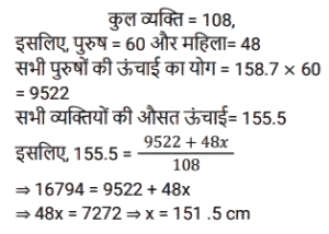 8. 108 व्यक्तियों के एक समूह में, पुरुषों और महिलाओं की संख्या का अनुपात 5 : 4 है। पुरुषों की औसत ऊंचाई 158.7 सेमी और महिलाओं की x सेमी है। यदि समूह में सभी व्यक्तियों की औसत ऊंचाई 155.5 सेमी है, तो x का मान क्या है? [SSC MTS 27/10/2021 (Afternoon)]