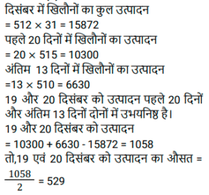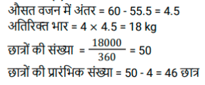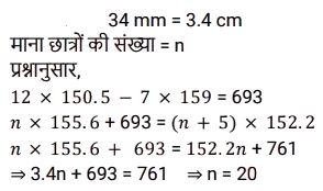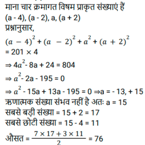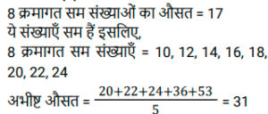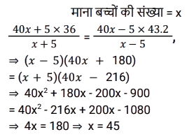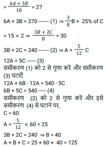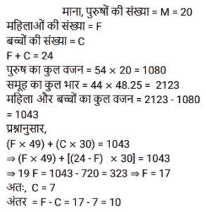 औसत (SSC) (Part-VII)Total Questions: 2711. आरोही क्रम में लिखी गई 8 क्रमागत सम संख्याओं का औसत 17 है। अंतिम तीन संख्याओं 36 और 53 का औसत क्या है? [SSC CGL 17/8/2021 (Morning)](a) 32.2(b) 29.8(c) 31.6(d) 31Correct Answer: (d) 31Solution:12. x के 5 बार और y के 7 बार होने का औसत 37 है। साथ ही, x के 7 बार होने और y के 5 बार होने का औसत 35 है। y का मान है: [SSC CGL 18/08/2021 (Morning)](a) 30(b) 27(c) 42(d) 45Correct Answer: (c) 42Solution:13. दिसंबर के महीने में एक कारखाने में खिलौनों का औसत दैनिक उत्पादन 512 है। यदि पहले 20 दिनों के दौरान औसत उत्पादन 515 और अंतिम 13 दिनों का औसत उत्पादन 510 है, तो 19 और 20 दिसंबर को उत्पादन का औसत क्या है? ? [SSC CGL 18/08/2021 (Evening)](a) 1058(b) 529(c) 513(d) 512Correct Answer: (b) 529Solution:14. एक कक्षा में छात्रों की एक निश्चित संख्या का औसत भार 55.5 किग्रा है। यदि 60 किग्रा के औसत भार वाले 4 विद्यार्थी कक्षा में शामिल हो जाते हैं, तो कक्षा के सभी विद्यार्थियों का औसत भार 360 ग्राम बढ़ जाता है। प्रारंभ में कक्षा में विद्यार्थियों की संख्या है। [SSC CGL 20/8/2021 (Evening)](a) 41(b) 31(c) 36(d) 46Correct Answer: (d) 46Solution:15. एक शिविर में कुछ बच्चे हैं और उनका औसत वजन 40 किग्रा है। यदि 36 किग्रा औसत वजन वाले 5 बच्चे शिविर में शामिल होते हैं या यदि 43.2 किग्रा औसत वजन वाले 5 बच्चे शिविर छोड़ देते हैं, तो दोनों ही मामलों में बच्चों का औसत वजन बराबर होता है। शिविर में प्रारंभ में कितने बच्चे हैं? [SSC CGL 23/8/2021 (Evening)](a) 35(b) 45(c) 40(d) 50Correct Answer: (b) 45Solution:16. प्रथम दस धनात्मक विषम संख्याओं के औसत और प्रथम पंद्रह धनात्मक सम संख्याओं के औसत का गुणनफल क्या है? [SSC CGL 24/8/2021 (Afternoon)](a) 85.25(b) 44(c) 160(d) 150Correct Answer: (c) 160Solution:17. किसी समूह में एक निश्चित छात्रों की संख्या की औसत ऊंचाई 155.6 सेमी है। यदि 150.5 सेमी की औसत ऊंचाई वाले 12 छात्र समूह में शामिल हो जाते हैं और 159 सेमी की औसत ऊंचाई वाले 7 छात्र समूह छोड़ देते हैं, तो समूह में छात्रों की औसत ऊंचाई 34 mm तक कम हो जाती है। प्रारंभ में, समूह में विद्यार्थियों की संख्या कितनी है? [SSC CHSL 5/8/2021 (Morning)](a) 30(b) 25(c) 40(d) 20Correct Answer: (d) 20Solution:18. चार क्रमागत विषम प्राकृत संख्याओं के वर्गों का औसत 201 है। सबसे बड़ी संख्या का 7 गुना और सबसे छोटी संख्या का 3 गुना का औसत है: [SSC CHSL 6/8/2021 (Evening)](a) 72(b) 78(c) 76(d) 66Correct Answer: (c) 76Solution:19. व्यक्ति के 3 समूह हैं- पुरुष, महिला और बच्चे। 20 पुरुष हैं और महिलाओं तथा बच्चों की कुल संख्या पुरुषों की तुलना में 4 अधिक है। पुरुषों का औसत वजन 54 किलो, महिलाओं का 49 किलो और बच्चों का 30 किलो है। यदि पूरे समूह का औसत वजन 48.25 किग्रा है, तो महिलाओं की संख्या और बच्चों की संख्या के बीच का अंतर क्या है? [SSC CHSL 10/8/2021 (Morning)](a) 17(b) 10(c) 7(d) 14Correct Answer: (b) 10Solution:20. A, B और C तीन धनात्मक संख्याएं हैं जैसे कि A के तीन-पांचवें और B के 30% का औसत 13.5 है और B के 3/8 गुना और C के 25% का औसत 15 है। यदि A, C के 5/12 गुना के बराबर है, तो तीनों संख्याओं A, B और C का योग है। [SSC CHSL 11/8/2021 (Afternoon)](a) 125(b) 135(c) 145(d) 120Correct Answer: (a) 125Solution:Submit Quiz« Previous123Next »