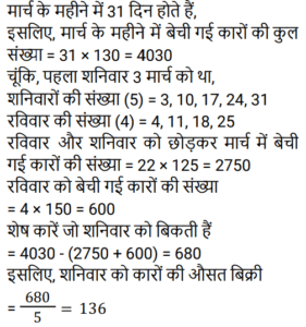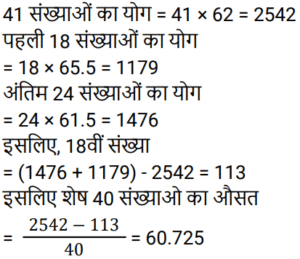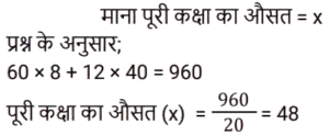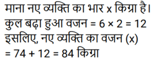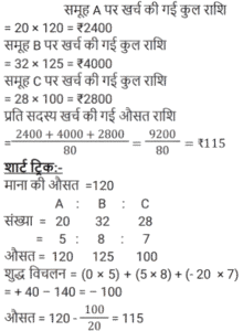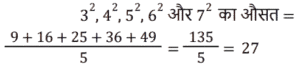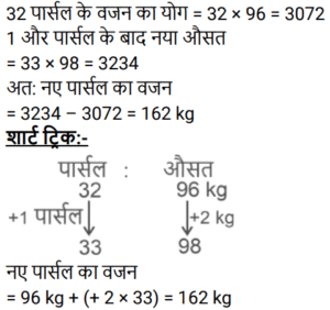 औसतTotal Questions: 5031. एक वर्ष में कृष्णा का कुल व्यय ₹4,20,000 है। यदि उसका प्रति माह वेतन ₹45,000 है, तो प्रति माह उसकी औसत बचत ज्ञात कीजिए। [Group D 08/09/2022 (Morning)](a) ₹16,000 (b) ₹10,000 (c) ₹12,000 (d) ₹14,000Correct Answer: (b) ₹10,000 Solution:32. शनिवार और रविवार को छोड़कर, मार्च के महीने में एक डीलर द्वारा की गई कारों की दैनिक औसत बिक्री 125 है। रविवार के लिए, कारों की दैनिक औसत बिक्री 150 है। यदि पहला शनिवार 3 मार्च को है, और पूरे महीने के दौरान कारों की दैनिक औसत बिक्री 130 है, तो शनिवारों के लिए कारों की दैनिक औसत बिक्री ज्ञात कीजिए? [Group D 08/09/2022 (Evening)](a) 140 (b) 136(c) 132 (d) 138Correct Answer: (b) 136Solution:33. समूह A में 20 सदस्य हैं, समूह B में 32 सदस्य हैं, और समूह C में 28 सदस्य हैं। इन समूहों के सभी सदस्य एक रेस्टोरां में गए। समूह A, B और C के प्रत्येक सदस्य पर खर्च हुई औसत राशि क्रमशः ₹120, ₹125 और ₹100 है। प्रत्येक सदस्य पर खर्च हुई कुल औसत राशि (₹ में) ज्ञात कीजिए। [Group D 08/09/2022 (Evening)](a) 115 (b) 118 (c) 116 (d) 112Correct Answer: (a) 115 Solution:34. 20 विद्यार्थियों वाली एक कक्षा, विज्ञान की परीक्षा देती है। 8 विद्यार्थियों के औसत (समान्तर माध्य) प्राप्तांक 60 थे। शेष विद्यार्थियों के औसत प्राप्तांक 40 थे। पूरी कक्षा के औसत प्राप्तांक ज्ञात कीजिए। [Group D 12/09/2022 (Morning)](a) 68(b) 48(c) 58(d) 40Correct Answer: (b) 48Solution:35. 11 और 30 के बीच की अभाज्य संख्याओं का औसत ज्ञात कीजिए। [Group D 12/09/2022 (Afternoon)](a) 19.6 (b) 20.2(c) 19.5 (d) 20.3Correct Answer: (b) 20.2Solution:36. 41 संख्याओं का औसत 62 है। पहली 18 संख्याओं का औसत 65.5 है, और अंतिम 24 संख्याओं का औसत 61.5 है। यदि प्रारंभ से 18वीं संख्या को छोड़ दिया जाता है, तो शेष संख्याओं का औसत क्या होगा? [Group D 12/09/2022 (Afternoon)](a) 60.725 (b) 61.625 (c) 60.5 (d) 61.325Correct Answer: (a) 60.725 Solution:37. 3², 4², 5², 6² और 7² का औसत ___ है। [Group D 14/09/2022 (Evening)](a) 24 (b) 27(c) 28 (d) 25Correct Answer: (b) 27Solution:38. प्रथम 35 प्राकृत संख्याओं का औसत कितना होगा? [Group D 15/09/2022 (Afternoon)](a) 18.5 (b) 17.5 (c) 17 (d) 18Correct Answer: (d) 18Solution:39. 6 व्यक्तियों के एक समूह से 72 kg वजन वाले एक व्यक्ति को एक अन्य व्यक्ति द्वारा प्रतिस्थापित करने पर समूह के औसत वजन में 2 kg की वृद्धि हो जाती है। समूह में शामिल हुए नए व्यक्ति का वजन कितना है? [Group D 16/09/2022 (Morning)](a) 74 kg (b) 84 kg(c) 104 kg (d) 94 kgCorrect Answer: (b) 84 kgSolution:40. 32 पार्सल का औसत वजन 96 kg दर्ज किया गया था। यदि एक और पार्सल का वजन शामिल किया जाता है, तो औसत में 2 kg की वृद्धि होती है। नए पार्सल का वजन ज्ञात कीजिए। [Group D 16/09/2022 (Afternoon)](a) 192 kg (b) 162 kg(c) 182 kg (d) 172 kgCorrect Answer: (b) 162 kgSolution:Submit Quiz« Previous12345Next »