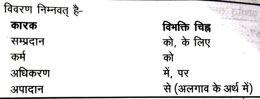 Solution:'राम की गाय चरती है', वाक्य में सम्बन्ध कारक है। इसका चिह्न है- का, की, के, रा, री, रे। कारक एवं उनके विभक्ति चिह्न इस प्रकार हैं-कर्त्ता-ने