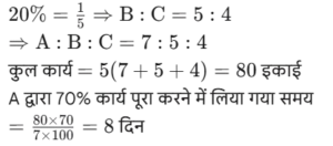 44. A, B से 40% अधिक कार्य कुशल है तथा C, B से 20% कम कार्य कुशल है। एक साथ कार्य करते हुए, वे किसी कार्य को 5 दिनों में पूरा कर सकते हैं। A इस कार्य का 70% भाग अकेले कितने दिनों में पूरा करेगा ? [SSC CGL 10/06/2019 (Afternoon)]