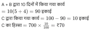 46. A किसी कार्य को 20 दिनों में कर सकता है जबकि B इसी कार्य को 25 दिनों में कर सकता है। उन्होंने एक साथ इस कार्य को शुरू किया। कुछ दिनों बाद C उनके साथ शामिल हो गया और इस प्रकार उन सभी ने इस पूरे कार्य को 10 दिनों में पूरा किया। उन सभी को कुल 700 रुपये का भुगतान किया गया। C का हिस्सा क्या है ? [SSC CPO 16/03/2019 (Evening)]