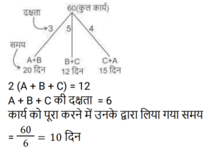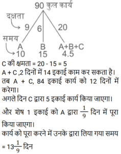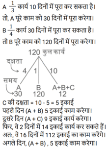 14. A किसी कार्य का 33⅓% भाग 10 दिनों में पूरा कर सकता है और B उसी कार्य का एक-चौथाई भाग 30 दिनों में पूरा कर सकता है। A, B और C मिलकर समान कार्य को 12 दिनों में पूरा कर सकते हैं। यदि A प्रत्येक दिन काम करता है, तथा B और C एक-एक दिन छोड़कर उसकी सहायता करते हैं, जिसमें पहले दिन B, A की सहायता करता है, तो ज्ञात कीजिए कि कार्य कितने दिनों में पूरा हो जाएगा? [Group D 26/09/2022 (Evening)]