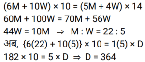 18. 6 पुरुष और 10 महिलाएं एक कार्य को 10 दिन में पूरा कर सकते हैं। 5 पुरुष और 4 महिलाएं उसी कार्य को 14 दिन में पूरा कर सकते हैं। 1 महिला को इस कार्य को पूरा करने में कितने दिन का समय लगेगा? [Group D 30/09/2022 (Afternoon)]