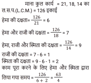 16. हेमा एक निश्चित कार्य को 21 दिनों में कर सकती है। हेमा और राजी एक साथ मिलकर उसी कार्य को 18 दिनों में कर सकते हैं, तथा हेमा, राजी और सिता एक साथ मिलकर उसी कार्य को 14 दिनों में कर सकते हैं। हेमा और सिता एक साथ काम करते हुए उस कार्य को कितने दिनों में कर सकती हैं? [Group D 29/09/2022 (Evening)]