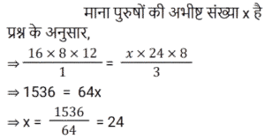 50. 16 पुरुष एक कार्य को 8 दिनों में प्रतिदिन 12 घंटे कार्य करके समाप्त कर सकते हैं। इसी कार्य के तीन गुना अधिक एक अन्य कार्य को 24 दिनों में प्रतिदिन 8 घंटे कार्य करके समाप्त करने के लिए कितने पुरुषों की आवश्यकता होगी? [RRB ALP 17/08/2018 (Morning)]