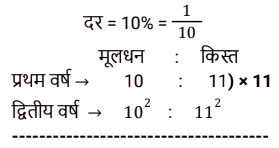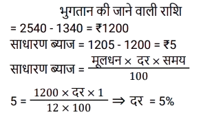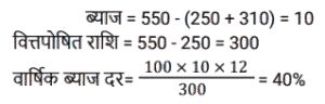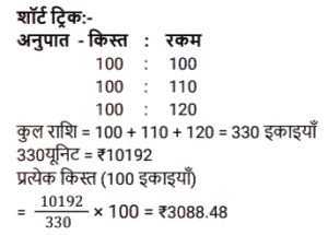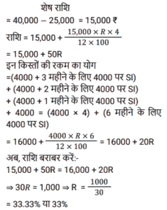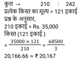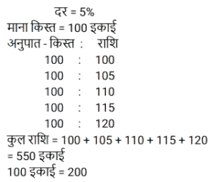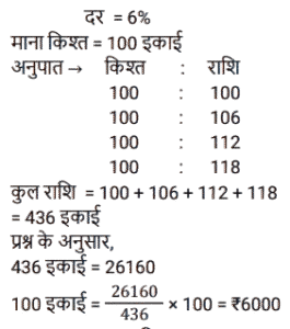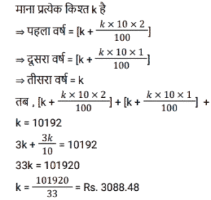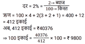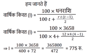 किश्त (SSC)Total Questions: 401. 6% वार्षिक साधारण ब्याज़ पर 4 वर्षों में देय ₹26,160 के ऋण को चुकता करने के लिए आवश्यक वार्षिक किस्त क्या होगी? [SSC CGL 10/09/2024 (2nd Shift)](a) ₹4,500(b) ₹5,500(c) ₹6,000(d) ₹5,800Correct Answer: (c) ₹6,000Solution:2. एक सेल फोन Rs.600 या Rs.300 नकद तत्काल भुगतान के साथ-साथ दो महीने के बाद Rs.360 का भुगतान करने पर उपलब्ध है। इस योजना के तहत ब्याज दर कितनी है? [SSC CGL 24/09/2024 (2nd Shift)](a) 60%(b) 120%(c) 20%(d) 50%Correct Answer: (b) 120%Solution:3. ऋण की वह राशि ज्ञात कीजिए जो प्रत्येक ₹200 की 5 बराबर किस्तों में चुकाई जाएगी, यदि ऋण 5% वार्षिक साधारण ब्याज की दर से 5 वर्षों में देय है। [SSC CHSL 02/07/2024 (3rd Shift)](a) ₹1,100(b) ₹1,200(c) ₹1,255(d) ₹1,400Correct Answer: (a) ₹1,100Solution:4. एक घड़ी ₹550 नकद या किश्त योजना में ₹250 नकद डाउन पेमेंट और एक महीने बाद ₹310 में बेची जाती है। किश्त योजना में लिए जाने वाले ब्याज की दर ज्ञात कीजिए। [SSC CHSL 04/07/2024 (1st Shift)](a) 35%(b) 45%(c) 40%(d) 20%Correct Answer: (c) 40%Solution:5. राहना ने एक स्कूटी खरीदने का फैसला किया जिसका मूल्य ₹40,000 है। दुकानदार ₹25,000 के नकद भुगतान और चार महीने तक हर महीने ₹4,000 के किश्त के भुगतान की शर्त के अंतर्गत स्कूटी बेचने पर सहमत हुआ। किश्त योजना के अंतर्गत दुकानदार ने जिस ब्याज दर पर स्कूटी बेची वह ज्ञात कीजिए। [SSC CHSL 04/07/2024 (3rd Shift)](a) 33%(b) 16 ½%(c) 18 ½%(d) 10 ½%Correct Answer: (a) 33%Solution:6. एक लैपटॉप चार्जर को Rs.2,540 नकद में या Rs.1,340 नकद और एक महीने के बाद Rs.1,205 के भुगतान पर बेचा जाता है। किश्त योजना में लिए जाने वाले ब्याज की दर ज्ञात कीजिए। [SSC CHSL 11/07/2024 (1st Shift)](a) 5% प्रति वर्ष(b) 10% प्रति वर्ष(c) 15% प्रति वर्ष(d) 20% प्रति वर्षCorrect Answer: (a) 5% प्रति वर्षSolution:7. 3 वर्षों में 10% साधारण ब्याज पर देय ₹10,192 के ऋण को कितने रूपये की वार्षिक किस्त से चुकाया जाएगा? [SSC CPO 27/06/2024 (2nd Shift)](a) ₹3,144.48(b) ₹3,044.48(c) ₹3,088.48(d) ₹3,188.48Correct Answer: (c) ₹3,088.48Solution:8. सीता Rs.35,000 का ऋण, वार्षिक रूप से चक्रवृद्धि होने वाली 10% वार्षिक चक्रवृद्धि ब्याज दर पर लेती है। वह 2 वर्षों में दो समान किश्तों में अर्थात् प्रत्येक वर्ष में अंत में एक किश्त का भुगतान करने के लिए सहमत है। प्रत्येक किश्त की राशि ज्ञात कीजिए। (उत्तर को निकटतम पूर्णांक तक पूर्णांकित करें) [SSC CPO 29/06/2024 (1st Shift)](a) ₹20,167(b) ₹40,167(c) ₹10,167(d) ₹30,167Correct Answer: (a) ₹20,167Solution:9. उस समान वार्षिक किस्त की धनराशि ज्ञात करें, जो 2% वार्षिक साधारण ब्याज की दर से 4 वर्षों में देय ₹40,376 के ऋण का भुगतान करेगी। [Matriculation Level 20/06/2024 (Shift-1)](a) Rs.9,800(b) Rs.8,758(c) Rs. 10,250(d) Rs.8,600Correct Answer: (a) Rs.9,800Solution:10. कितनी वार्षिक किस्त 4 वर्षों में 12% साधारण ब्याज प्रति वर्ष पर देय Rs. 3,658 के ऋण को समाप्त करेगी ? [Higher Secondary 20/06/2024 (Shift-2)](a) Rs.825(b) Rs.725(c) Rs.750(d) Rs.775Correct Answer: (d) Rs.775Solution:Submit Quiz1234Next »