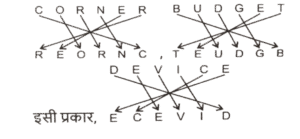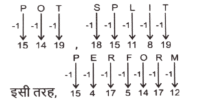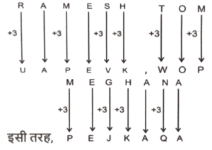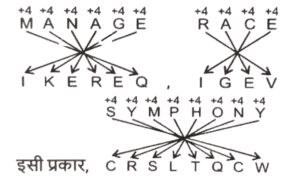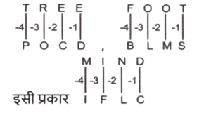 कोडिंग डिकोडिंग (भाग-III)Total Questions: 501. एक निश्चित कूट भाषा में, 'spin fast slow' को 'mm nn oo' लिखा जाता है और 'fast skid slip' को 'nn rr tt' लिखा जाता है और 'slip slow jump' को 'rr mm zz' लिखा जाता है। उस कूट भाषा में 'jump' को कैसे लिखा जाएगा ? [SSC MTS 14/10/2024 (Morning)](a) IT(b) ZZ(c) mm(d) nnCorrect Answer: (b) ZZSolution:2. एक निश्चित कूट भाषा में, 'TIME' को 61 के रूप में कूटबद्ध किया जाता है और 'POND' को 59 के रूप में कूटबद्ध किया जाता है। उसी भाषा में 'BLUE' को किस प्रकार कूटबद्ध किया जाएगा ? [SSC MTS 14/10/2024 (Afternoon)](a) 68(b) 69(c) 71(d) 72Correct Answer: (a) 68Solution:3. एक कूट भाषा में, 'RAMESH' को 'UAPEVK' के रूप में लिखा जाता है और 'TOM' को 'WOP' के रूप में लिखा जाता है। उसी भाषा में 'MEGHANA' को किस प्रकार लिखा जाएगा ? [SSC MTS 14/10/2024 (Evening)](a) QEJKAQA(b) PEJKAQA(c) QDJKAQA(d) PDJKAQACorrect Answer: (b) PEJKAQASolution:4. एक निश्चित कूट भाषा में, 'MANAGE को 'IKEREQ' के रूप में कूटबद्ध किया जाता है और 'RACE' को 'IGEV' के रूप में कूटबद्ध किया जाता है। दी गई कूट भाषा में 'SYMPHONY' के लिए कूट क्या है ? [SSC MTS 15/10/2024 (Morning)](a) CRSLTRCW(b) CRSLSQCW(c) CRSLTPCW(d) CRSLTQCWCorrect Answer: (d) CRSLTQCWSolution:5. एक निश्चित कूट भाषा में 'CORNER' को 'REORNC' के रूप में और 'BUDGET' को 'TEUDGB' के रूप में लिखा जाता है। उस भाषा में 'DEVICE' कैसे लिखा जाएगा ? [SSC MTS 15/10/2024 (Evening)](a) ECIVED(b) EVECID(c) EDEVIC(d) ECEVIDCorrect Answer: (d) ECEVIDSolution:6. एक निश्चित कूट भाषा में, 'POT' को '15 - 14 - 19' के रूप में कूटबद्ध किया जाता है और 'SPLIT' को '18 - 15 - 11 - 8 - 19' के रूप में कूटबद्ध किया जाता है। दी गई कूट भाषा में 'PERFORM' के लिए कूट क्या है ? [SSC MTS 16/10/2024 (Evening)](a) 15 - 4 - 17 - 6 - 14 - 17 - 12(b) 15 - 4 - 17 - 5 - 15 - 17 - 12(c) 15 - 4 - 17 - 5 - 14 - 17 - 12(d) 15 - 4 - 17 - 5 - 14 - 17 - 13Correct Answer: (c) 15 - 4 - 17 - 5 - 14 - 17 - 12Solution:7. एक निश्चित कूट भाषा में, 'TREE' को 'POCD' के रूप में कूटबद्ध किया जाता है और 'FOOT' को 'BLMS' के रूप में कूटबद्ध किया जाता है। उसी भाषा में 'MIND' को किस प्रकार कूटबद्ध किया जाएगा ? [SSC MTS 17/10/2024 (Evening)](a) JEKD(b) JFLD(c) IFLC(d) IEKDCorrect Answer: (c) IFLCSolution:8. किसी कूट भाषा में, 'ZHBN' को 'BEFI" के रूप में कूटबद्ध किया जाता है और 'LFWJ' को 'NCAE' के रूप में कूटबद्ध किया जाता है। उसी 'भाषा में 'HVDK' को किस प्रकार कूटबद्ध किया जाएगा ? [SSC MTS 29/10/2024 (Evening)](a) KSIF(b) KTJD(c) JSHF(d) JTHDCorrect Answer: (c) JSHFSolution:9. एक निश्चित कूट भाषा में, 'PEN' को '16-05-14' लिखा जाता है और 'CAR' को '03-01-18' लिखा जाता है। उस कूट भाषा में 'KITE' को कैसे लिखा जाएगा ? [SSC MTS 30/10/2024 (Afternoon)](a) 11 - 10 - 20 - 04(b) 10 - 09 - 20 - 05(c) 10 - 12 - 20 - 03(d) 11 - 09 - 20 - 05Correct Answer: (d) 11 - 09 - 20 - 05Solution:तर्क :- अक्षरों को सीधे उनके स्थानीय मान के रूप में कोडित किया जाता है। PEN :- (16 - 05 - 14) CAR :-(3 - 01 - 18) इसी प्रकार, (KITE) :- (11 - 09 - 20 - 05)10. एक निश्चित कूट भाषा में, 'I Love biryani' को 'qs vx pg' के रूप में लिखा जाता है और 'biryani was good' को 'vx pm ed' के रूप में लिखा जाता है। दी गई कूट भाषा में "biryani' को कैसे लिखा जाता है ? [SSC MTS 05/11/2024 (Afternoon)](a) ed(b) vx(c) qs(d) pmCorrect Answer: (b) vxSolution:I love biryani :- qs vx pg......(i) biryani was good :- vx pm ed.....(ii) (i) और (ii) से 'biryani' का कोड = 'vx'Submit Quiz12345Next »