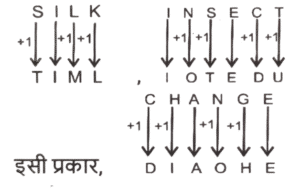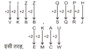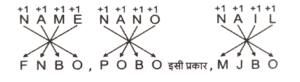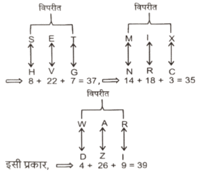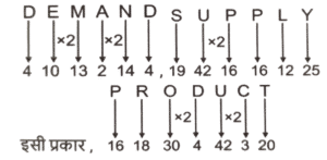 कोडिंग डिकोडिंग (भाग-III)Total Questions: 5021. एक निश्चित कूट भाषा में, 'NAME' को 'FNBO' लिखा जाता है और 'NANO' को 'POBO' लिखा जाता है। इसी कूट भाषा में 'NAIL' को किस प्रकार लिखा जाएगा ? [SSC CGL 09/09/2024 (1st Shift)](a) MJOB(b) MJBO(c) MOJB(d) MOBJCorrect Answer: (b) MJBOSolution:22. एक निश्चित कोड भाषा में, 'SILK' को 'TIML' लिखा जाता है और 'INSECT' को 'IOTEDU' लिखा जाता है। उसी भाषा में 'CHANGE' को कैसे लिखा जाएगा ? [SSC CGL 09/09/2024 (3rd Shift)](a) DOIHAE(b) DEIOHA(c) DEIHAO(d) DIAOHECorrect Answer: (d) DIAOHESolution:23. एक निश्चित कूट भाषा में, 'SET' को '37' के रूप में कूटबद्ध किया जाता है और 'MIX' को '35' के रूप में कूटबद्ध किया जाता है। उसी भाषा में 'WAR' को किस प्रकार कूटबद्ध किया जाएगा ? [SSC CGL 09/09/2024 (3rd Shift)](a) 39(b) 21(c) 32(d) 29Correct Answer: (a) 39Solution:24. एक निश्चित कूट भाषा में, 'sit on chair' को 'sk mi crn' के रूप में कूटबद्ध किया गया है और 'the chair broke' को 'gm fr mi' के रूप में कूटबद्ध किया गया है। दी गई भाषा में 'chair' को किस प्रकार से कूटबद्ध किया जाएगा ? [SSC CGL 10/09/2024 (1st Shift)](a) sk(b) cn(c) mi(d) gmCorrect Answer: (c) miSolution:sit on chair → sk mi cn......(i) the chair broke → gm fr mi.....(ii) (i) और (ii) से 'chair' और 'mi' उभयनिष्ठ हैं। 'chair' का कोड = 'mi'25. एक निश्चित कूट भाषा में, 'Cows' को '7935' के रूप में कूटबद्ध किया जाता है और 'OILY' को '2568' के रूप में कूटबद्ध किया जाता है। उस भाषा में '0' के लिए कूट क्या है ? [SSC CGL 10/09/2024 (2nd Shift)](a) 5(b) 8(c) 2(d) 9Correct Answer: (a) 5Solution:COWS → 7935 and OILY → 2568. दोनों कोड भाषाओं में उभयनिष्ठ शब्द 'O' और संख्या '5' है।26. एक निश्चित कूट भाषा में, 'TIZZ' को 'VKBB' के रूप में लिखा जाता है और 'QOPH' को 'SQRJ' के रूप में लिखा जाता है। उसी भाषा में 'CKAU' को किस प्रकार लिखा जाएगा ? [SSC CGL 10/09/2024 (2nd Shift)](a) EMCW(b) DNBV(c) ENCV(d) DMBWCorrect Answer: (a) EMCWSolution:27. एक निश्चित कूट भाषा में, 'VERY' को '6314' के रूप में लिखा जाता है और 'VARY' को '1438' के रूप में लिखा जाता है। उसी भाषा में 'A' को किस प्रकार लिखा जाएगा ? [SSC CGL 10/09/2024 (3rd Shift)](a) 6(b) 8(c) 4(d) 1Correct Answer: (b) 8Solution:दिया गया:- VERY → 6314......(i) VARY → 1438.......(ii) (i) और (ii) से 'VRY' और '143' उभयनिष्ठ हैं। 'A' का कोड = '8'.28. एक निश्चित कूट भाषा में, 'CONFUSED' को '7' के रूप में कूटबद्ध किया जाता है और 'CHAIN' को '4' के रूप में कूटबद्ध किया जाता है। उसी भाषा में 'ADULTHOOD' को किस प्रकार कूटबद्ध किया जाएगा ? [SSC CGL 11/09/2024 (1st Shift)](a) 9(b) 7(c) 8(d) 6Correct Answer: (c) 8Solution:CONFUSED :- शब्द में अक्षरों की संख्या (8) - 1 = 7 CHAIN :- शब्द में अक्षरों की संख्या (5) - 1 = 4 इसी प्रकार, ADULTHOOD :- शब्द में अक्षरों की संख्या (9) - 1 = 829. एक निश्चित कूट भाषा में, 'DEMAND' को '410132144' लिखा जाता है और 'SUPPLY' को '194216161225' लिखा जाता है। उसी भाषा में 'PRODUCT' को क्या लिखा जाएगा [SSC CGL 11/09/2024 (1st Shift)](a) 161830442320(b) 323615821640(c) 161542320(d) 161815421320Correct Answer: (a) 161830442320Solution:तर्क :- व्यंजन यथावत और स्वर × 2 30. एक निश्चित कूट भाषा में, 'BUZZY' को '10' के रूप में कूटबद्ध किया जाता है और 'KING' को '8' के रूप में कूटबद्ध किया जाता है। उसी भाषा में 'ABROAD' को किस प्रकार कूटबद्ध किया जाएगा ? [SSC CGL 11/09/2024 (2nd Shift)](a) 10(b) 7(c) 9(d) 12Correct Answer: (d) 12Solution:तर्क:- (अक्षरों की संख्या) × 2 BUZZY :- (5) × 2 = 10 KING :- (4) × 2 = 10 इसी प्रकार, ABROAD :- (6) × 2 = 12Submit Quiz« Previous12345Next »