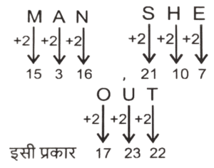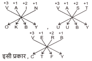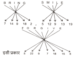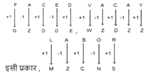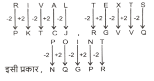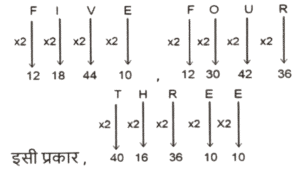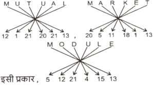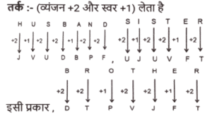कोडिंग डिकोडिंग (भाग-III)Total Questions: 5031. एक निश्चित कूट भाषा में, 'VAIN' को 'OKBY' लिखा जाता है और 'VAST' को 'UUBY' लिखा जाता है। इसी कूट भाषा में 'VERB' को किस प्रकार लिखा जाएगा ? [SSC CGL 11/09/2024 (2nd Shift)](a) CFTY(b) CTFY(c) CTYF(d) CFYTCorrect Answer: (b) CTFYSolution:32. एक निश्चित कूट भाषा में, 'MAN' को '15316' के रूप में कूटबद्ध किया जाता है और 'SHE' को '21107' के रूप में कूटबद्ध किया जाता है। उसी भाषा में 'OUT' को किस प्रकार कूटबद्ध किया जाएगा ? [SSC CGL 11/09/2024 (3rd Shift)](a) 152120(b) 172121(c) 172322(d) 152222Correct Answer: (c) 172322Solution:33. एक निश्चित कूट भाषा में, BRING को '7149182' कूटबद्ध किया जाता है और SMILE को '51291319' कूटबद्ध किया जाता है। उसी कूट भाषा में FORGIVE के लिए कूट क्या होगा ? [SSC CGL 11/09/2024 (3rd Shift)](a) 5229179156(b) 5228717156(c) 5219717166(d) 5229718156Correct Answer: (d) 5229718156Solution:34. एक निश्चित कोड कूट में, 'FACED' को 'GZDDE' के रूप में लिखा जाता है और 'VACAY' को 'WZDZZ' के रूप में लिखा जाता है। उसी भाषा में 'LABOR' को किस प्रकार लिखा जाएगा ? [SSC CGL 12/09/2024 (1st Shift)](a) MZCNS(b) MBCPS(c) MBDPS(d) MADMSCorrect Answer: (a) MZCNSSolution:35. एक निश्चित कोड भाषा में, 'FIVE' को '12184410' और 'FOUR' को '12304236' लिखा जाता है। उसी भाषा में 'THREE' कैसे लिखा जाएगा ? [SSC CGL 12/09/2024 (1st Shift)](a) 4016361110(b) 4016361310(c) 4016361212(d) 4016361010Correct Answer: (d) 4016361010Solution:36. एक निश्चित कूट भाषा में 'talk to me' को 'aq yt bl' के रूप में कूटबद्ध किया जाता है और 'do not talk' को 'yt me wc' के रूप में कूटबद्ध किया जाता है। उस भाषा में 'talk' के लिए कूट क्या है ? [SSC CGL 12/09/2024 (2nd Shift)](a) yt(b) wc(c) bl(d) aqCorrect Answer: (a) ytSolution:talk to me → aq yt bl (i) do not talk → yt me wc .(ii) दोनों समीकरणों में 'talk' और 'yt' उभयनिष्ठ है तो, 'talk' कोड 'yt' है।37. एक निश्चित कूट भाषा में, 'RIVAL' को 'PKTCJ' के रूप में कूटबद्ध किया जाता है और 'TEXTS' को 'RGVVQ' के रूप में कूटबद्ध किया जाता है। दी गई भाषा में 'POINT' को किस प्रकार कूटबद्ध किया जाएगा ? [SSC CGL 12/09/2024 (3rd Shift)](a) NRGOR(b) OQGPO(c) NQGPR(d) OQGOQCorrect Answer: (c) NQGPRSolution:38. एक निश्चित कूट भाषा में, 'MUTUAL' को '12121202113' लिखा जाता है, 'MARKET' को '2051118113' लिखा जाता है, उसी कूट भाषा में 'MODULE' को कैसे लिखा जाएगा ? [SSC CGL 12/09/2024 (3rd Shift)](a) 1315421125(b) 5122141513(c) 5122141613(d) 14122361522Correct Answer: (b) 5122141513Solution:39. एक निश्चित कूट भाषा में 'mountain stand tall' को '33 66 44' के रूप में कूटबद्ध किया जाता है; 'rocky is tall' को '44 55 11' के रूप में कूटबद्ध किया गया है और 'rocky is mountain' को '33 55 11' के रूप में कूटबद्ध किया गया है। उसी भाषा में 'stand' को किस प्रकार कूटबद्ध किया गया है ? [SSC CGL 13/09/2024 (1st Shift)](a) 33(b) 66(c) 44(d) 11Correct Answer: (b) 66Solution:40. एक निश्चित कोड भाषा में, 'HUSBAND' को 'JVUDBPF' लिखा जाता है और 'SISTER' को 'UJUVFT' लिखा जाता है। उसी भाषा में 'BROTHER' को कैसे लिखा जाएगा ? [SSC CGL 13/09/2024 (1st Shift)](a) DJTFPTV(b) DTPVJFT(c) TFVJTPD(d) FJPVDTTCorrect Answer: (b) DTPVJFTSolution:Submit Quiz« Previous12345Next »