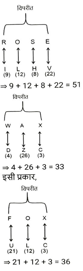 कोडिंग डिकोडिंग (भाग-VII)Total Questions: 5011. एक निश्चित कूट भाषा में ROSE को 51 और WAX को 33 के रूप में कूटबद्ध किया जाता है। उसी भाषा में FOX को कैसे कूटबद्ध किया जाएगा ? [Graduate Level 20/06/2024 (Shift - 3)](a) 36(b) 31(c) 35(d) 40Correct Answer: (a) 36Solution:तर्क :- विपरीत अक्षरों के स्थानीय मान का योग12. एक कूट भाषा में, 'THENW' को 'WNEHT' के रूप में कूटबद्ध किया जाता है और 'HOVER' को 'REVOH' के रूप में कूटबद्ध किया जाता है। उसी भाषा में 'SWAMP' को किस प्रकार कूटबद्ध किया जाएगा ? [Graduate Level 20/06/2024 (Shift - 3)](a) PMAWS(b) PWAMS(c) PMBWS(d) PAWMSCorrect Answer: (a) PMAWSSolution:13. एक निश्चित कूट भाषा में, 'CAN' को '63' के रूप में लिखा जाता है और 'TWO' को '23' के रूप में लिखा जाता है। उसी भाषा में 'USE' को कैसे लिखा जाएगा ? [Graduate Level 20/06/2024 (Shift - 3)](a) 33(b) 43(c) 51(d) 36Correct Answer: (d) 36Solution:तर्क :- विपरीत अक्षर के स्थानीय मान का योग 14. एक निश्चित कूट भाषा में, 'WBRP' को '59' के रूप में कूटबद्ध किया जाता है और 'MSAQ' को '50' के रूप में कूटबद्ध किया जाता है। उसी भाषा में 'FUZJ' को किस रूप में कूटबद्ध किया जाएगा ? [Graduate Level 20/06/2024 (Shift - 3)](a) 69(b) 63(c) 54(d) 58Correct Answer: (b) 63Solution:तर्क :- अक्षरों के स्थानीय मान का योग WBRP :- 23 + 2 + 18 + 16 )= 59 MSAQ :- (13 + 19 + 1 + 17) = 50 इसी प्रकार, FUZJ :- (6 + 21 +26 + 10) = 6315. एक निश्चित कूट भाषा में, 'break the wall' को 'jl mt hk' लिखा जाता हैऔर 'wall is black' को 'zy hk bs' लिखा जाता है। दी गई भाषा में 'wall' को किस प्रकार लिखा जाता है ? [Graduate Level 20/06/2024 (Shift - 3)](a) hk(b) jl(c) bs(d) zyCorrect Answer: (a) hkSolution:16. एक निश्चित कूट भाषा में, 'ASK' को '100' के रूप में लिखा जाता है और 'BAG' को '142' के रूप में लिखा जाता है। उसी भाषा में 'DIE' को कैसे लिखा जाएगा ? [Graduate Level 21/06/2024 (Shift - 3)](a) 134(b) 144(c) 118(d) 126Correct Answer: (d) 126Solution:तर्क :- (विपरीत अक्षरों के स्थानीय मान का योग) × 2 17. एक निश्चित कूट भाषा में, 'REO' को '22919' के रूप में कूटबद्ध किया जाता है और 'BVL' को '62616' के रूप में कूटबद्ध किया जाता है। उसी भाषा में 'DUX' को किस रूप में कूटबद्ध किया जाएगा ? [Graduate Level 21/06/2024 (Shift - 3)](a) 72467(b) 83536(c) 82528(d) 74617Correct Answer: (c) 82528Solution:18. एक निश्चित कूट भाषा में, 'i like apple' को 'rt gf po' और 'you like orange' को 'po bv sd' के रूप में कूटबद्ध किया जाता है। इसी भाषा में 'like' को किस प्रकार कूटबद्ध किया जाएगा ? [Graduate Level 21/06/2024 (Shift - 3)](a) po(b) bv(c) sd(d) gfCorrect Answer: (a) poSolution:i like apple → rt gf po ........(i) you like orange → po bv sd..........(ii) (i) और (ii) से 'like' का कोड 'po' होगा।19. एक निश्चित कूट भाषा में, 'RUB' को '22118' के रूप में लिखा जाता है और 'Sow' को '231519' के रूप में लिखा जाता है। उसी भाषा में 'WHY' को कैसे लिखा जाएगा ? [Graduate Level 21/06/2024 (Shift - 3)](a) 231024(b) 25103(c) 23825(d) 25823Correct Answer: (d) 25823Solution:तर्क : अक्षरों को सीधे उनके स्थानीय मान के रूप में कोडित किया गया है। 20. एक निश्चित कूट भाषा में, 'BAGS' को '43921' के रूप में कूटबद्ध किया जाता है और 'KHEM' को '1310715' के रूप में कूटबद्ध किया जाता है। उसी भाषा में 'JINK' को किस रूप में कूटबद्ध किया जाएगा ? [Graduate Level 24/06/2024 (Shift - 3)](a) 11101512(b) 11121413(c) 109811(d) 12111613Correct Answer: (d) 12111613Solution:Submit Quiz« Previous12345Next »
