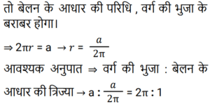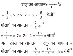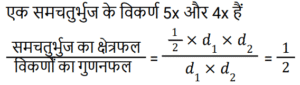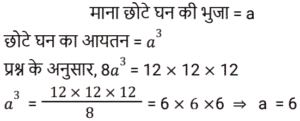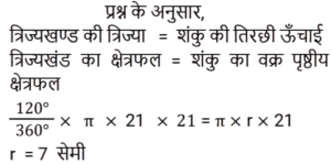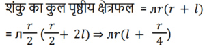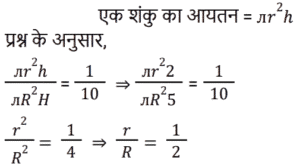 क्षेत्रमिति Part – 10Total Questions: 5011. यदि किसी समचतुर्भुज के विकर्ण 5 : 4 के अनुपात में हैं, तो समचतुर्भुज के क्षेत्रफल और उसके विकर्णों के गुणनफल का अनुपात ज्ञात कीजिए। [RRB JE 27/05/2019 (Evening)](a) 4 : 1(b) 2 : 1(c) 1 : 2(d) 1 : 4Correct Answer: (c) 1 : 2Solution:12. दो शंकु ऐसे हैं, जिनके आयतन का अनुपात 1 : 10 है और उनकी ऊंचाईयों का अनुपात 2 : 5 है। उनकी आधर त्रिज्यों का अनुपात ज्ञात कीजिए। [RRB JE 28/05/2019 (Morning)](a) 1 : 2(b) 7 : 25(c) 2 : 1(d) 5 : 2Correct Answer: (a) 1 : 2Solution:13. तिरछी ऊंचाई '2l' और त्रिज्या 'r/2' वाले शंकु का कुल पृष्ठीय क्षेत्रफल ज्ञात कीजिए। [RRB JE 28/05/2019 (Afternoon)](a)(b)(c)(d)Correct Answer: (b)Solution:14. एक आयताकार प्लॉट की लंबाई उसकी चौड़ाई से 20 मीटर अधिक है। यदि प्लॉट पर ₹26.50 प्रति मीटर की दर से बाड़ लगाने की लागत ₹5300 है, तो प्लॉट की लंबाई मीटर में ज्ञात कीजिए। [RRB JE 29/05/2019 (Morning)](a) 50 मीटर(b) 40 मीटर(c) 120 मीटर(d) 60 मीटरCorrect Answer: (d) 60 मीटरSolution:15. 21 सेमी त्रिज्या और केंद्र कोण 120° वाले एक त्रुटखंड को मोड़क शंकु के रूप में बदल दिया जाता है। इस प्रकार बने शंकु की त्रिज्या ज्ञात कीजिए। [RRB JE 29/05/2019 (Morning)](a) 42 सेमी(b) 21 सेमी(c) 7 सेमी(d) 7.5 सेमीCorrect Answer: (c) 7 सेमीSolution:16. दो समरूप त्रिभुजों में, उनकी संगत भुजाओं का अनुपात 1 : 3 है और बड़े त्रिभुज का क्षेत्रफल 72 वर्ग सेमी है। छोटे त्रिभुज का क्षेत्रफल ज्ञात कीजिए। [RRB JE 29/05/2019 (Morning)](a) 18 वर्ग सेमी(b) 8 वर्ग सेमी(c) 14 वर्ग सेमी(d) 9 वर्ग सेमीCorrect Answer: (b) 8 वर्ग सेमीSolution:17. कागज की एक चौकोर शीट को इसकी भुजा की तरफ से मोड़कर एक बेलन के रूप में बदल दिया जाता है। वर्ग की भुजा और बेलन की आधार त्रिज्या का अनुपात ज्ञात कीजिए [RRB JE 29/05/2019 (Evening)](a) 2π : 1 (b) 1 : 4π (c) 1 : π (d) 1 : 2πCorrect Answer: (a) 2π : 1 Solution:18. एक ठोस, एक अर्धगोले पर लगे शंकु के आकार का है, दोनों की त्रिज्या 2 सेमी है और शंकु की ऊँचाई इसकी त्रिज्या के बराबर है। इस ठोस का आयतन क्या है? [RRB JE 30/05/2019 (Morning)](a) 2π सेमी³ (b) 6π सेमी³ (c) 8π सेमी³(d) 4π सेमी³Correct Answer: (c) 8π सेमी³Solution:19. 12 सेमी भुजा वाले एक ठोस घन को बराबर आयतन वाले आठ छोटे घनों के रूप में काटा जाता है। छोटे घन की भुजा ज्ञात कीजिए। [RRB JE 30/05/2019 (Morning)](a) 3 सेमी (b) 6 सेमी(c) 1.5 सेमी (d) 4 सेमीCorrect Answer: (b) 6 सेमीSolution:20. एक आयत की चौड़ाई ‘a’ और लंबाई ‘b’ है। यदि चौड़ाई को 20% कम और लंबाई को 10% बढ़ाया जाता तो नए बने आयत का क्षेत्रफल ‘ab’ की तुलना में कितने प्रतिशत होगा? [RRB JE 30/05/2019 (Morning)](a) 120% (b) 80% (c) 88%(d) 110%Correct Answer: (c) 88%Solution:Submit Quiz« Previous12345Next »