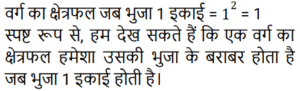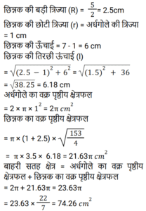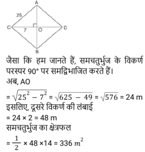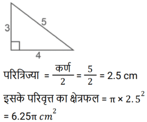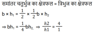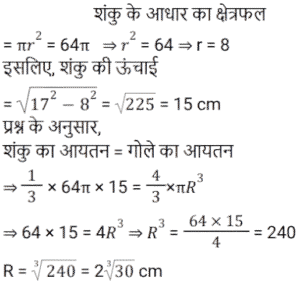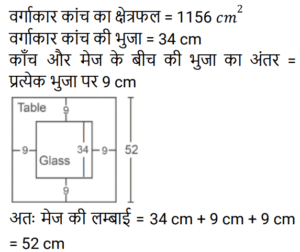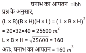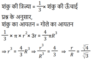 क्षेत्रमिति Part – 11Total Questions: 3011. शीशे के वर्गाकार टुकड़े का संपूर्ण क्षेत्रफल 1156 cm² है। जिसे एक मेज के ऊपर रखा गया है। मेज और कांच के टुकड़े के बीच की चौड़ाई 9 cm है। मेज की लंबाई बताएं (cm में) [RPF S.I. 10/01/2019 (Morning)](a) 52 (b) 51 (c) 53 (d) 50Correct Answer: (a) 52 Solution:12. एक लंबवृतीय शंकु का आयतन, जिसके आधार की त्रिज्या उसकी ऊँचाई की एक तिहाई है, एक गोलार्ध के आयतन के बराबर है। शंकु की त्रिज्या और गोलार्ध की त्रिज्या का अनुपात कितना है? [RRB ALP 09/08/2018 (Morning)](a) 1 : 1 (b) ³√4 : ³√3(c) ³√3 : ³√2 (d) ³√4 : 1Correct Answer: (b) ³√4 : ³√3Solution:13. किसी घनाभ की तीन सतहों के क्षेत्रफल 20m², 32m² और 40m² हैं। घनाभ का आयतन कितना है? [RRB ALP 09/08/2018 (Afternoon)](a) 184m³ (b) 92m³(c) √3024 m³ (d) 160m³Correct Answer: (d) 160m³Solution:14. एक समकोण त्रिभुज में समकोण को धारण करने वाली दो भुजाएँ 3 सेमी और 4 सेमी लंबी हैं। इसके परिवृत्त का क्षेत्रफल होगा: [RRB ALP 09/08/2018 (Afternoon)](a) 5π cm² (b) 6.75π cm²(c) 7π cm² (d) 6.25π cm²Correct Answer: (d) 6.25π cm²Solution:15. एक लॉन रोलर एक घंटे में 20 चक्कर लगाता है। 25 मिनट के दौरान यह कितने रेडियन चलेगा? [RRB ALP 10/08/2018 (Morning)](a) 50π⁄3 (b) 150π⁄7 (c) 250π⁄3 (d) 50π⁄7Correct Answer: (a) 50π⁄3 Solution:16. बैडमिंटन खेलने के लिए इस्तेमाल किये जाने वाले एक शटलकॉक का आकार एक गोलार्ध पर बने हुए शंकु के छिछक (frustum) जैसा है। छिछक (frustum) का बाहरी व्यास 5 सेंटीमीटर और 2 सेंटीमीटर है, पूरे शटलकॉक की ऊँचाई 7 सेंटीमीटर है। बाहरी पृष्ठीय क्षेत्रफल ज्ञात कीजिए। [RRB ALP 10/08/2018 (Morning)](a) 74.30 वर्ग सेंटीमीटर(b) 74.26 वर्ग सेंटीमीटर(c) 80 वर्ग सेंटीमीटर(d) 73.38 वर्ग सेंटीमीटरCorrect Answer: (b) 74.26 वर्ग सेंटीमीटरSolution:17. यदि भुजा 1 इकाई हो तो वर्ग का क्षेत्रफल उसकी भुजा के बराबर होता है। [RRB ALP 10/08/2018 (Afternoon)](a) हमेशा (b) कभी नहीं(c) कभी-कभी (d) अक्सरCorrect Answer: (a) हमेशा Solution:18. किसी त्रिभुज का आधार उसके समान क्षेत्रफल वाले समांतर चतुर्भुज के आधार का आधा है। त्रिभुज और चतुर्भुज के आधारों से संलग्न ऊँचाइयों का अनुपात क्या होगा? [RRB ALP 10/08/2018 (Afternoon)](a) 2 : 1 (b) 1 : 4 (c) 1 : 2 (d) 4 : 1Correct Answer: (d) 4 : 1Solution:19. एक शंकु के आधार का क्षेत्रफल 64π वर्ग सेंटीमीटर है जबकि इसकी तिरछी ऊँचाई 17 सेंटीमीटर है। इस शंकु को ठोस गोलार्ध प्राप्त करने के लिए फिर से तैयार किया गया है। इस गोले की त्रिज्या कितनी होगी? [RRB ALP 14/08/2018 (Afternoon)](a) 6.5 सेंटीमीटर (b) 2³√30 सेंटीमीटर(c) 2³√40 सेंटीमीटर (d) 8³√30 सेंटीमीटरCorrect Answer: (b) 2³√30 सेंटीमीटरSolution:20. किसी समचतुर्भुज के प्रत्येक भुजा की लंबाई 25 मीटर और एक विकर्ण की लंबाई 14 मीटर है। समचतुर्भुज का क्षेत्रफल क्या है? [RRB ALP 14/08/2018 (Evening)](a) 336 वर्ग मीटर(b) 350 वर्ग मीटर(c) 175 वर्ग मीटर(d) 168 वर्ग मीटरCorrect Answer: (a) 336 वर्ग मीटरSolution:Submit Quiz« Previous123Next »