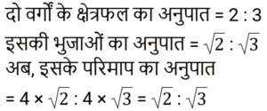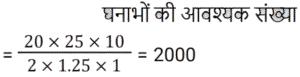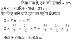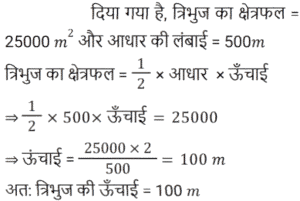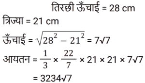 क्षेत्रमिति Part -3Total Questions: 5011. यदि एक गोले का व्यास 12 cm है, तो गोले का आयतन ज्ञात कीजिए। (π = 22/7 का उपयोग कीजिए) [Group D 17/09/2022 (Evening)](a) 907 4/7 cm³(b) 906 6/7 cm³(c) 905 1/7 cm³(d) 908 2/7 cm³Correct Answer: (c) 905 1/7 cm³Solution:12. एक बंद धात्विक बेलनाकार पात्र 1.05 m ऊँचा है और इसकी आधार त्रिज्या 35 cm है। यदि धातु की शीट का मूल्य ₹150 प्रति m² है, तो इस पात्र में प्रयुक्त सामग्री का मूल्य ज्ञात कीजिए। [π = 22/7 का उपयोग कीजिए] [Group D 18/09/2022 (Morning)](a) ₹514 (b) ₹462(c) ₹336 (d) ₹360Correct Answer: (b) ₹462Solution:13. यदि एक गोले के आयतन को उसके पृष्ठीय क्षेत्रफल से विभाजित किया जाता है, तो परिणाम 9 cm प्राप्त होता है। गोले की त्रिज्या (cm में) ज्ञात कीजिए। [Group D 18/09/2022 (Afternoon)](a) 27 (b) 81 (c) 4.5 (d) 18Correct Answer: (a) 27 Solution:14. पानी के एक खुले ड्रम की आकृति बेलनाकार है। इस ड्रम की ऊँचाई 7 m और आंतरिक व्यास 21 m है। यदि ड्रम की आंतरिक सतह को पेंट किया जाना हो, तो पेंट किए जाने वाले क्षेत्र का क्षेत्रफल (m² में) ज्ञात कीजिए। [Group D 18/09/2022 (Evening)](π = 22/7 मान लीजिए)(a) 462 (b) 577.5 (c) 1155 (d) 808.5Correct Answer: (d) 808.5Solution:15. यदि दो वर्गों के क्षेत्रफलों का अनुपात 2 : 3 है, तो इन दोनों वर्गों के परिमापों का अनुपात दिए गए क्रम में _______ है। [Group D 19/09/2022 (Morning)](a) √2 : 3(b) 4 : 9(c) 2 : √3(d) √2 : √3Correct Answer: (d) √2 : √3Solution:16. एक बेलन के आधार की त्रिज्या 4 cm से बढ़ाकर 16 cm कर दी जाती है, लेकिन इसका वक्र पृष्ठीय क्षेत्रफल अपरिवर्तित रहता है। यदि बेलन की प्रारंभिक ऊँचाई 4 cm थी, तो उसकी नई ऊँचाई क्या होगी? [Group D 19/09/2022 (Morning)](b) 1 cm(a) 2 cm (c) 3 cm (d) 4 cmCorrect Answer: (b) 1 cmSolution:17. एक लम्ब वृतीय शंकु का आयतन (सेमी³ में), जिसकी तिरछी ऊँचाई 28 सेमी और आधार की त्रिज्या 21 सेमी है, _______ है [Group D 19/09/2022 (Evening)](π = 22/7 लें)(a) 30808(b) 1617√7(c) 3234√7(d) 38808Correct Answer: (c) 3234√7Solution:18. एक घन के प्रत्येक किनारे की लंबाई में 50% की वृद्धि की जाती है। सतह क्षेत्र में प्रतिशत वृद्धि है: [Group D 19/09/2022 (Evening)](a) 225% (b) 150% (c) 25% (d) 125%Correct Answer: (d) 125%Solution:19. एक क्षेत्र त्रिभुज के रूप में है। इसका क्षेत्रफल 25000 m² है और आधार की लंबाई 500 m है। दिए गए आधार के अनुरूप इसकी ऊँचाई (मीटर में) है __________ [Group D 20/09/2022 (Morning)](a) 200 (b) 175 (c) 50 (d) 100Correct Answer: (d) 100Solution:20. एक घनामाकार भंडारण स्थान की विमाएं 20 m, 25 m और 10 m हैं। इसमें 2 m × 1.25 m × 1 m विमाओं वाले कितने डिब्बे रखे जा सकते हैं? [Group D 20/09/2022 ( Afternoon )](a) 8000(b) 2000(c) 6000(d) 4000Correct Answer: (b) 2000Solution:Submit Quiz« Previous12345Next »