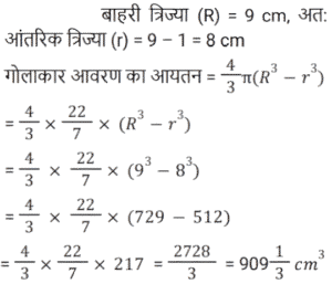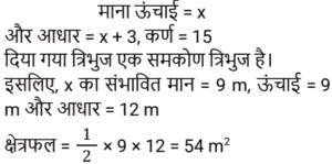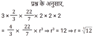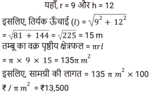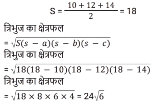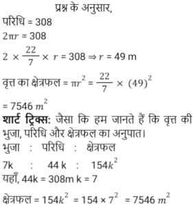 क्षेत्रमिति Part -4Total Questions: 5011. एक आयत की लंबाई उसकी चौड़ाई से 5 सेमी अधिक है। यदि आयत का क्षेत्रफल 215 cm² है, तो आयत की चौड़ाई (w) ज्ञात करने का समीकरण है: [Group D 11/10/2022 ( Morning )](a) w² – 5w – 215 = 0(b) 2w² – 5w – 215 = 0(c) w² + 5w + 215 = 0(d) w² + 5w – 215 = 0Correct Answer: (d) w² + 5w – 215 = 0Solution:12. त्रिज्या 2 इकाई के 3 ठोस गोल्डों को पिघलाया जाता है और एक गोले में पुन: ढाला जाता है। नव निर्मित एकल गोले की त्रिज्या (दी गई इकाइयों में) ज्ञात कीजिए। [Group D 11/10/2022 ( Morning )](a) ³√12(b) ²√10(c) 3(d) ²√15Correct Answer: (a) ³√12Solution:13. उस त्रिभुज का क्षेत्रफल ज्ञात कीजिए जिसका आधार 126.4 सेमी और ऊँचाई 54.8 सेमी है। [Group D 11/10/2022 ( Afternoon )](a) 3343.36 cm²(b) 9267.72 cm²(c) 6926.72 cm²(d) 3463.36 cm²Correct Answer: (d) 3463.36 cm²Solution:14. एक त्रिभुज का क्षेत्रफल है जिसकी भुजाएँ 10 cm, 12 cm और 14 cm हैं। [Group D 11/10/2022 ( Afternoon )](a) 32√3 cm²(b) 25√5 cm²(c) 30√2 cm²(d) 24√6 cm²Correct Answer: (d) 24√6 cm²Solution:15. एक त्रिभुज का क्षेत्रफल 85 सेमी² है और इसका आधार 5 सेमी है। दिए गए आधार के संगत त्रिभुज की ऊँचाई ज्ञात कीजिए। [Group D 11/10/2022 ( Evening )](a) 51 cm(b) 34 cm(c) 24 cm(d) 17 cmCorrect Answer: (b) 34 cmSolution:16. एक समकोण त्रिभुज का आधार उसकी ऊँचाई से 3 मीटर बड़ा है। यदि इसका कर्ण 15 मीटर है, तो इसका क्षेत्रफल ज्ञात कीजिए। [Group D 11/10/2022 ( Evening )](a) 84 m²(b) 64 m²(c) 72 m²(d) 54 m²Correct Answer: (d) 54 m²Solution:17. एक वृत्त की परिधि 308 m दी गई है। वृत्त का क्षेत्रफल क्या है ? [Use π = 22/7] [Level 6 (09/05/2022) Shift 1](a) 7646 m²(b) 7546 m²(c) 7556 m²(d) 7446 m²Correct Answer: (b) 7546 m²Solution:18. ABCE एक आयत है जिसमें AB = 10 cm और BC = 8 cm है। O, आयत ABCE की तीन भुजाओं AB, BC और CE को छूने वाले वृत्त का केंद्र है। △OBC का क्षेत्रफल (cm² में) ज्ञात कीजिए। [Level 6 (09/05/2022) Shift 1](a) 24(b) 16(c) 22(d) 20Correct Answer: (b) 16Solution:19. एक गोलाकार खोल की बाहरी त्रिज्या 9 cm है और खोल की मोटाई 1 cm है। खोल के लिए प्रयुक्त धातु का आयतन ज्ञात कीजिए (घन cm में)। ( π = 22/7 लेने पर) [Level 6 (09/05/2022) Shift 1](a)(b)(c)(d)Correct Answer: (c)Solution:20. शंक्वाकार तम्बू के आधार की त्रिज्या 9 मीटर है और इसकी ऊँचाई 12 मीटर है, इसे बनाने के लिए आवश्यक सामग्री की लागत ज्ञात कीजिए यदि इसकी लागत ₹100 प्रति π वर्ग मीटर है? [Level 6 (09/05/2022) Shift 1](a) ₹14,500(b) ₹13,000(c) ₹15,000(d) ₹13,500Correct Answer: (d) ₹13,500Solution:Submit Quiz« Previous12345Next »