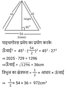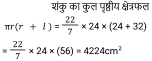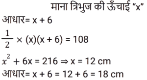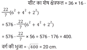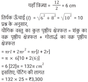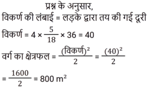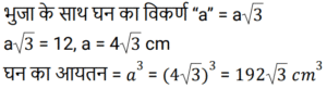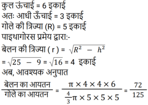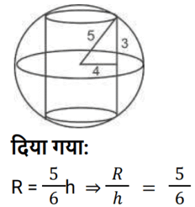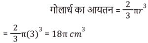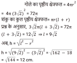 क्षेत्रमिति Part -4Total Questions: 5021. एक लम्ब वृतीय शंकु एक अर्धगोले पर आरोहित है। शंकु की आधार त्रिज्या अर्धगोले की त्रिज्या के बराबर है। अर्धगोले का व्यास 12 cm है जबकि शंकु की ऊँचाई 8 cm है। संयुक्त वस्तु को पेंट करने की लागत ज्ञात कीजिए, यदि π cm² को पेंट करने में ₹25 का खर्च आता है। [Level 6 (09/05/2022) Shift 1](a) ₹10,371(b) ₹3,300(c) ₹9,930(d) ₹4,500Correct Answer: (b) ₹3,300Solution:22. 3 cm त्रिज्या वाले गोलार्ध का आयतन क्या है? [Level 6 (09/05/2022) Shift 2](a) 18π cm³(b) 9π cm³(c) 27π cm³(d) 36π cm³Correct Answer: (a) 18π cm³Solution:23. 36 cm लंबाई और 16 cm चौड़ाई की एक आयताकार धातु की शीट से, 6 cm, 4 cm और 2 cm त्रिज्या की तीन वृत्ताकार प्लेटों को काटा जाता है। यदि धातु की शीट के शेष भाग का क्षेत्रफल एक वर्ग के क्षेत्रफल के बराबर है, तो वर्ग की प्रत्येक भुजा की लंबाई (cm में) ज्ञात कीजिए। [Level 6 (09/05/2022) Shift 2]( π = 22/7 लीजिए )(a) 18.6(b) 18(c) 19.4(d) 20Correct Answer: (d) 20Solution:24. यदि एक घन का मुख्य विकर्ण 12 cm लंबा है, तो घन का आयतन ज्ञात कीजिए। [Level 6 (09/05/2022) Shift 2](a) 64√3 cm³(b) 128√3 cm³(c) 192√3 cm³(d) 192 cm³Correct Answer: (c) 192√3 cm³Solution:25. एक गोले की त्रिज्या और शंकु की आधार त्रिज्या दोनों 3√2 cm हैं। यदि गोले का सतही क्षेत्रफल लम्ब वृत्ताकार शंकु के कुल पृष्ठीय क्षेत्रफल के समान है, तो शंकु की ऊँचाई क्या है? [Level 6 (09/05/2022) Shift 2](a) 8 cm(b) 9√2 cm(c) 12 cm(d) 8√2 cmCorrect Answer: (c) 12 cmSolution:26. एक त्रिभुज के आधार की लंबाई संगत ऊँचाई से 6 cm अधिक है। यदि त्रिभुज का क्षेत्रफल 108 cm² है, तो त्रिभुज के आधार की लंबाई ज्ञात कीजिए। [Level 6 (09/05/2022) Shift 2](a) 12 cm(b) 9 cm(c) 18 cm(d) 27 cmCorrect Answer: (c) 18 cmSolution:27. एक शंकु का कुल पृष्ठीय क्षेत्रफल (m² में) ज्ञात कीजिए यदि इसकी तिरछी ऊँचाई 32 m है और इसके आधार का व्यास 48 m है। [Level 4 (10/05/2022) Shift 1]( π = 22/7 लीजिए )(a)(b)(c)(d)Correct Answer: (c)Solution:28. एक लड़का 4 km प्रति घंटे की गति से चलता है। एक वर्गाकार क्षेत्र को 36 सेकंड में तिरछे पार करता है। क्षेत्र का क्षेत्रफल (m² में) क्या है? [Level 4 (10/05/2022) Shift 1](a) 800(b) 800/√2(c) 800√2(d) 1600Correct Answer: (a) 800Solution:29. एक समद्विबाहु त्रिभुज का क्षेत्रफल ज्ञात कीजिए जिसका आधार 54 cm लंबा है और प्रत्येक बराबर भुजा 45 cm लंबी है। [Level 4 (10/05/2022) Shift 1](a) 1944 cm²(b) 1215 cm²(c) 972 cm²(d) 1620 cm²Correct Answer: (c) 972 cm²Solution:30. एक बेलन एक गोले में अंकित है। गोले की त्रिज्या बेलन की ऊँचाई का 5/6 गुना है। बेलन के आयतन और गोले के आयतन का अनुपात क्या है? [Level 4 (10/05/2022) Shift 1](a) 27 : 50(b) 72 : 125(c) 6 : 5(d) 36 : 25Correct Answer: (b) 72 : 125Solution:Submit Quiz« Previous12345Next »