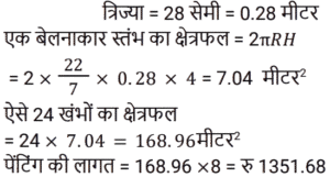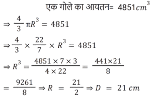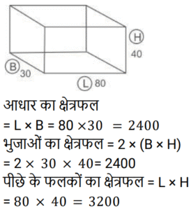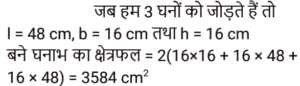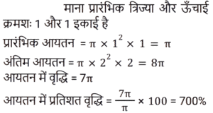 क्षेत्रमिति Part -7Total Questions: 5011. एक बेलन और एक शंकु की ऊँचाई और उनके आधार की त्रिज्या समान है। शंकु के आयतन का बेलन के आयतन से अनुपात है? [RRB NTPC 28/01/2021 (Evening)](a) 3 : 2(b) 1 : 3(c) 3 : 1(d) 2 : 3Correct Answer: (b) 1 : 3Solution:12. 9 cm लंबाई, 6 cm चौड़ाई और 6 cm ऊँचाई वाले घनाभ को पिघलाकर 3 cm भुजा वाले कितने घन बनाए जा सकते हैं? [RRB NTPC 29/01/2021 (Morning)](a) 13(b) 12(c) 11(d) 14Correct Answer: (b) 12Solution:13. किसी भवन में 24 बेलनाकार खंभे हैं। प्रत्येक खंभे की त्रिज्या 28 cm और ऊँचाई 4 m है। ₹8/m² की दर पर उन सभी खंभों के वक्र पृष्ठीय क्षेत्र पर रंगाई का खर्च ज्ञात कीजिए। [RRB NTPC 29/01/2021 (Morning)](a) Rs. 1,352.98(b) Rs. 1,354.78(c) Rs. 1,350.45(d) Rs. 1,351.68Correct Answer: (d) Rs. 1,351.68Solution:14. 16 cm भुजा वाले 3 घनों को एक पंक्ति में कंधे से कंधा मिलाकर जोड़ा गया है। इस प्रकार बने घनाभ का पृष्ठीय क्षेत्रफल ज्ञात कीजिए? [RRB NTPC 30/01/2021 (Morning)](a) 3588 cm²(b) 3600 cm²(c) 3584 cm²(d) 3564 cm²Correct Answer: (c) 3584 cm²Solution:15. यदि एक ठोस लंब वृत्तीय बेलन की ऊँचाई और त्रिज्या को दुगुना कर दिया जाए, तो उसके आयतन में प्रतिशत वृद्धि ज्ञात कीजिए? [RRB NTPC 30/01/2021 (Morning)](a) 700%(b) 600%(c) 400%(d) 300%Correct Answer: (a) 700%Solution:16. एक घनाकार कमरे का आंतरिक माप 12 m, 8 m, 4 m है जिसकी ऊँचाई 4 m है। कमरे की छत के साथ-साथ चारों दीवारों को सफेदी करने की कुल लागत ज्ञात कीजिए, यदि सफेदी की लागत 5 रुपये प्रति वर्ग मीटर है? [RRB NTPC 30/01/2021 (Evening)](a) Rs 1180(b) Rs 1380(c) Rs 1080(d) Rs 1280Correct Answer: (d) Rs 1280Solution:17. यदि एक गोले का आयतन 4851 cm³ दिया गया है, तो उसका व्यास ज्ञात कीजिए? (π = 22/7 का उपयोग कीजिए) [RRB NTPC 31/01/2021 (Morning)](a) 10.5 cm(b) 42 cm(c) 28 cm(d) 21 cmCorrect Answer: (d) 21 cmSolution:18. एक मछलीघर एक घनाभ के आकार का है जिसका बाहरी माप 80 cm × 30 cm × 40 cm है। आधार, पार्श्व फलक और पृष्ठ फलक को रंगीन कागज से ढकना है। आवश्यक कागज का क्षेत्रफल ज्ञात कीजिए? [RRB NTPC 31/01/2021 (Evening)](a) 6000 cm²(b) 8000 cm²(c) 8050 cm²(d) 8080 cm²Correct Answer: (b) 8000 cm²Solution:19. 40 मीटर लंबी, 80 सेंटीमीटर चौड़ी और 6 मीटर ऊँचाई वाली दीवार के लिए 25 सेमी लंबाई, 5 सेमी चौड़ाई और 20 सेमी ऊँचाई वाली ईंटों की संख्या ज्ञात कीजिए। [RRB NTPC 31/01/2021 (Evening)](a) 75898(b) 78986(c) 76800(d) 74524Correct Answer: (c) 76800Solution:20. दो गोलों के आयतन का अनुपात क्या है जहाँ वक्र पृष्ठीय क्षेत्रफल 1 : 4 के अनुपात में हैं? [RRB NTPC 01/02/2021 (Evening)](a) 1 : 4(b) 8 : 1(c) 1 : 8(d) 8 : 13Correct Answer: (c) 1 : 8Solution:Submit Quiz« Previous12345Next »