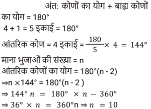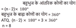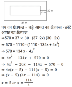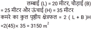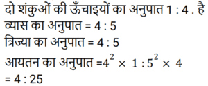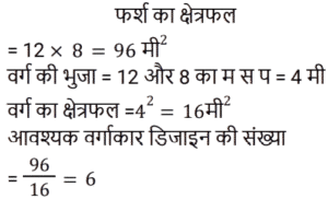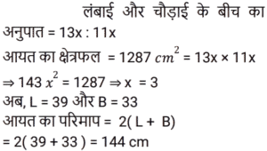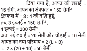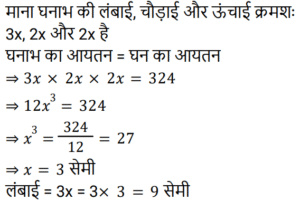 क्षेत्रमिति Part -7Total Questions: 5021. एक आयताकार पार्क के भीतरी भाग के चारों ओर एक पथ जिसकी विमाएँ 37 m × 30 m है जो 570 m² घेरेता है। पथ की चौड़ाई क्या है? [RRB NTPC 01/02/2021 (Evening)](a) 10 m(b) 15 m(c) 5 m(d) 28 mCorrect Answer: (c) 5 mSolution:22. 324 cm³ आयतन वाले घन को एक घनाभ में ढाला जाता है जिसकी लंबाई, चौड़ाई और ऊँचाई 3 : 2 : 2 के अनुपात में है। घनाभ की लंबाई ज्ञात कीजिए। [RRB NTPC 02/02/2021 (Evening)](a) 6 cm(b) 12 cm(c) 9 cm(d) 7.5 cmCorrect Answer: (c) 9 cmSolution:23. एक सम बहुभुज के एक आंतरिक कोण का बाहरी कोण से अनुपात 4 : 1 है। बहुभुज की भुजाओं की संख्या कितनी है? [RRB NTPC 03/02/2021 (Morning)](a) 12(b) 10(c) 5(d) 6Correct Answer: (b) 10Solution:24. यदि दो शंकुओं की ऊँचाइयों का अनुपात 1 : 4 है और व्यास अनुपात 4 : 5 में हैं, तो उनके आयतनों का अनुपात क्या है? [RRB NTPC 03/02/2021 (Evening)](a) 4 : 25(b) 13 : 25(c) 7 : 17(d) 5 : 9Correct Answer: (a) 4 : 25Solution:25. यदि एक कमरे की लंबाई, चौड़ाई और ऊँचाई क्रमशः: 20 m, 25 m और 35 m है, तो कमरे की चारों दीवारों का कुल पृष्ठीय क्षेत्रफल कितना होगा? [RRB NTPC 04/02/2021 (Morning)](a) 3145 m²(b) 3140 m²(c) 3150 m²(d) 3155 m²Correct Answer: (c) 3150 m²Solution:26. एक लंब वृतीय बेलन में वक्र पृष्ठीय क्षेत्रफल का कुल पृष्ठीय क्षेत्रफल से अनुपात 5 : 9 है। बेलन की ऊँचाई का बेलन की त्रिज्या से अनुपात ज्ञात कीजिए। [RRB NTPC 04/02/2021 (Morning)](a) 3 : 5(b) 5 : 4(c) 4 : 5(d) 5 : 3Correct Answer: (b) 5 : 4Solution:27. 12 मीटर लंबे और 8 मीटर चौड़े कमरे के फर्श को अधिकतम संभव क्षेत्र के वर्गों द्वारा डिजाइन किया जाना है। आवश्यक वर्गाकार डिजाइनों की संख्या ज्ञात कीजिए। [RRB NTPC 04/02/2021 (Evening)](a) 5(b) 6(c) 8(d) 4Correct Answer: (b) 6Solution:28. एक बहुभुज में, आंतरिक कोणों का योग बाह्य कोण के योग का तिगुना होता है। भुजाओं की संख्या कितनी है? [RRB NTPC 04/02/2021 (Evening)](a) 8(b) 7(c) 6(d) 9Correct Answer: (a) 8Solution:29. एक आयत की लंबाई 15 cm और क्षेत्रफल 150 cm² है। यदि केवल इसकी लंबाई बढ़ाकर क्षेत्रफल को मूल क्षेत्रफल का 1⅓ गुना कर दिया जाए, तो नया परिमाप क्या होगा? [RRB NTPC 05/02/2021 (Morning)](a) 70 cm(b) 60 cm(c) 80 cm(d) 50 cmCorrect Answer: (b) 60 cmSolution:30. एक आयत का क्षेत्रफल 1287 cm² है और लंबाई और चौड़ाई क्रमशः 13 : 11 के अनुपात में है। इसकी परिधि क्या है? [RRB NTPC 08/02/2021 (Morning)](a) 140 cm(b) 144 cm(c) 142 cm(d) 138 cmCorrect Answer: (b) 144 cmSolution:Submit Quiz« Previous12345Next »