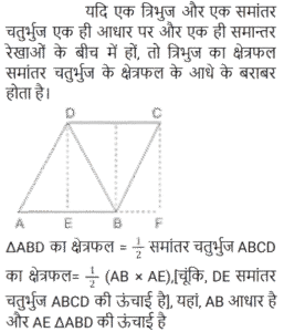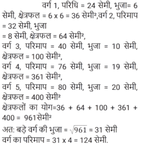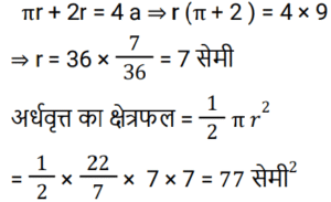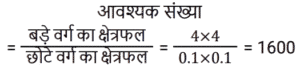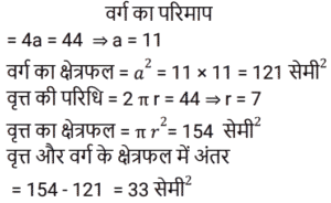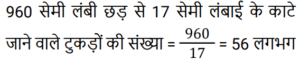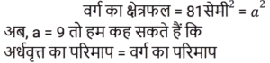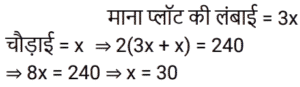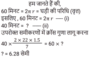 क्षेत्रमिति Part -7Total Questions: 5031. 960 cm लंबी छड़ से अधिकतम 17 cm लंबाई के अधिकतम कितने टुकड़े काटे जा सकते हैं? [RRB NTPC 08/02/2021 (Morning)](a) 56(b) 58(c) 60(d) 54Correct Answer: (a) 56Solution:32. यदि बेलन का आधार शंकु के समान है और बेलन की ऊँचाई भी शंकु के समान है, तो बेलन और शंकु के आयतन का अनुपात ज्ञात कीजिए। [RRB NTPC 08/02/2021 (Evening)](a) 1 : 3(b) 3 : 2(c) 2 : 3(d) 3 : 1Correct Answer: (d) 3 : 1Solution:33. एक रेफ्रिजरेटर में एक बर्फ के डिब्बे का आयाम 8 cm × 5 cm × 4 cm है। यदि प्रत्येक बर्फ के टुकड़े इसके किनारे पर 2 cm हैं, तो इसमें कितने बर्फ के टुकड़े होंगे? [RRB NTPC 09/02/2021 (Morning)](a) 40(b) 80(c) 20(d) 24Correct Answer: (c) 20Solution:34. जब एक तार को एक वर्ग के आकार में मोड़ा जाता है, तो वर्ग का क्षेत्रफल 81 cm² होता है। जब तार को अर्धवृत्ताकार आकार में मोड़ा जाता है, तो अर्धवृत्त का क्षेत्रफल क्या होगा? (π = 22/7 लीजिए) [RRB NTPC 10/02/2021 (Morning)](a) 77 cm²(b) 11 cm²(c) 77 m²(d) 7 cm²Correct Answer: (a) 77 cm²Solution:35. 44 cm परिमाप वाले एक वर्ग और 44 cm परिधि वाले एक वृत्त के बीच, किस आकृति का क्षेत्रफल अधिक है और कितना है? [RRB NTPC 10/02/2021 (Morning)](a) वर्ग, 34 cm²(b) वृत्त, 23 cm²(c) वर्ग, 33 cm²(d) वृत्त, 33 cm²Correct Answer: (d) वृत्त, 33 cm²Solution:36. यदि एक त्रिभुज और एक समांतर चतुर्भुज एक ही आधार पर और एक ही समांतर रेखाओं के बीच हों, तो त्रिभुज का क्षेत्रफल बराबर होता है? [RRB NTPC 10/02/2021 (Evening)](a) समांतर चतुर्भुज का क्षेत्रफल(b) समांतर चतुर्भुज के क्षेत्रफल का तीन-चौथाई(c) समांतर चतुर्भुज का आधा क्षेत्रफल(d) समांतर चतुर्भुज के क्षेत्रफल का एक तिहाईCorrect Answer: (c) समांतर चतुर्भुज का आधा क्षेत्रफलSolution:37. पाँच वर्ग के परिमाप क्रमशः: 24 cm, 32 cm, 40 cm, 76 cm और 80 cm हैं। एक अन्य वर्ग का परिमाप, जिसका क्षेत्रफल इन वर्गों के क्षेत्रफलों के योग के बराबर है, वह क्या होगा? [RRB NTPC 10/02/2021 (Evening)](a) 120 cm(b) 128 cm(c) 124 cm(d) 100 cmCorrect Answer: (c) 124 cmSolution:38. एक घड़ी की मिनट की सुई 1.5 cm लंबी होती है। 40 मिनट में इसकी नोक कितनी दूरी तक जाती है? (π = 3.14 लीजिए) [RRB NTPC 10/02/2021 (Evening)](a) 6.28 cm(b) π cm(c) 6.00 cm(d) 2π mCorrect Answer: (a) 6.28 cmSolution:39. यदि एक वर्ग की भुजा 1/10 m है, तो 4 m भुजा वाले बड़े वर्ग में ऐसे कितने वर्ग होंगे? [RRB NTPC 10/02/2021 (Evening)](a) 1200(b) 1650(c) 1500(d) 1600Correct Answer: (d) 1600Solution:40. एक आयताकार भूखंड की चौड़ाई उसकी लंबाई की एक तिहाई है। यदि भूखंड की परिधि 240 मीटर है, तो भूखंड की लंबाई क्या है? [RRB NTPC 11/02/2021 (Morning)](a) 70 m(b) 60 m(c) 90 m(d) 95 mCorrect Answer: (c) 90 mSolution:Submit Quiz« Previous12345Next »